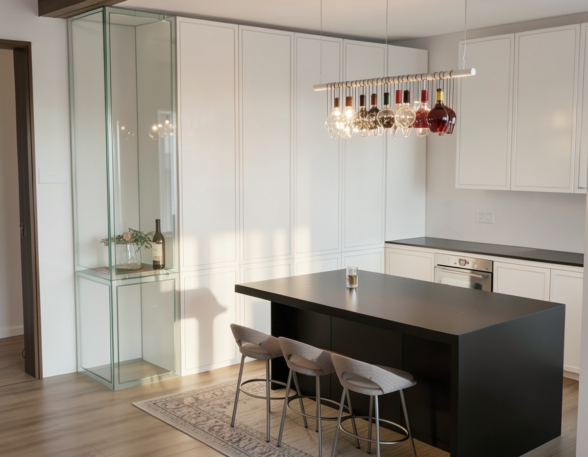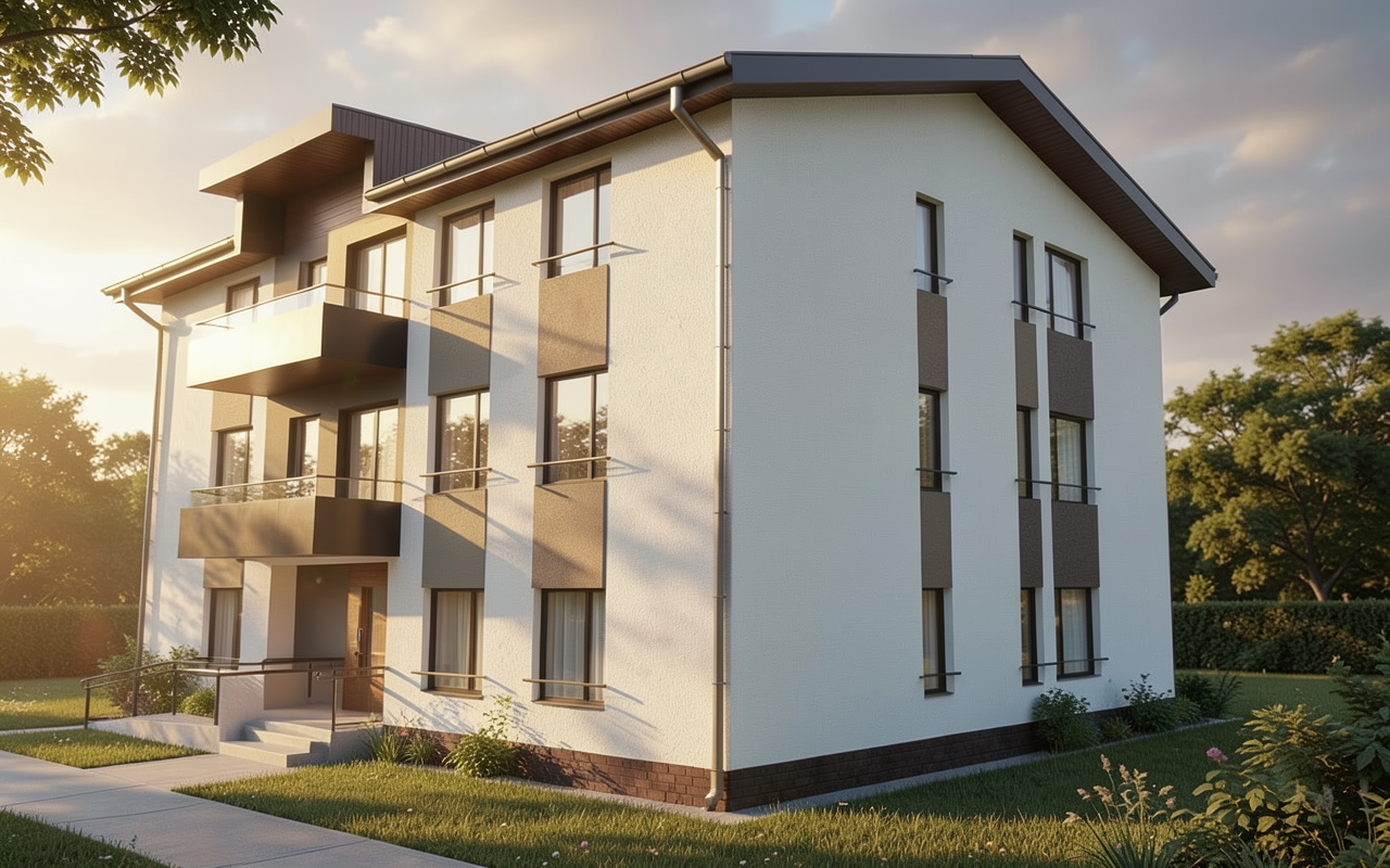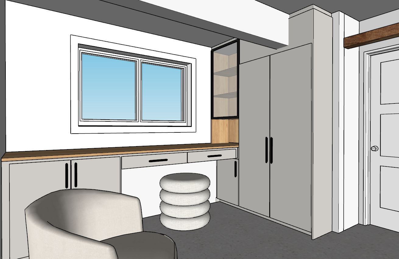 ambiance chaleureuse style chambre d hotel add coffee machine add book on the library shelves the floor is grey terrazzo style ceramic add a blind in front of the window add a laptop to the desktop the armchair and bench are pale grey the furniture is very pale grey the same color as the walls only the beam in front of the door is wood finish the other one is white gypsum as the celing add tree over the window evening hot lightroom