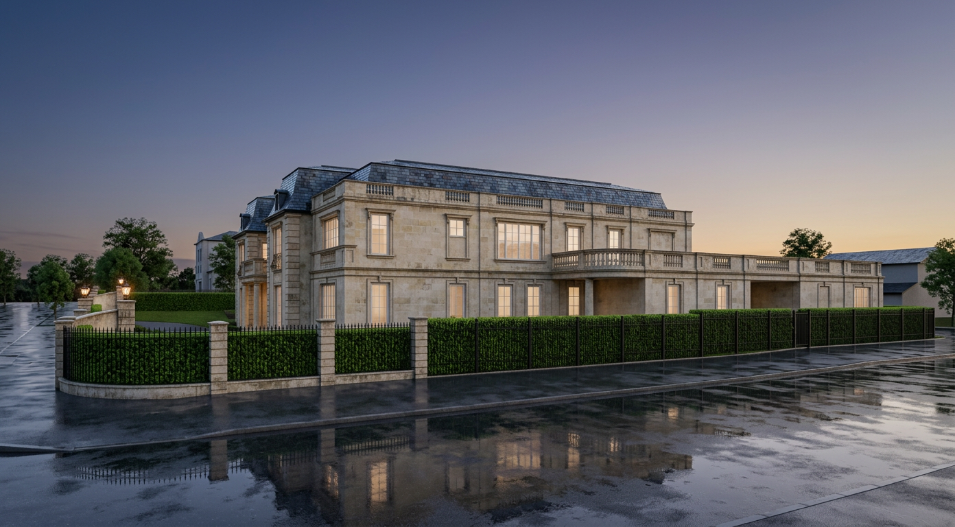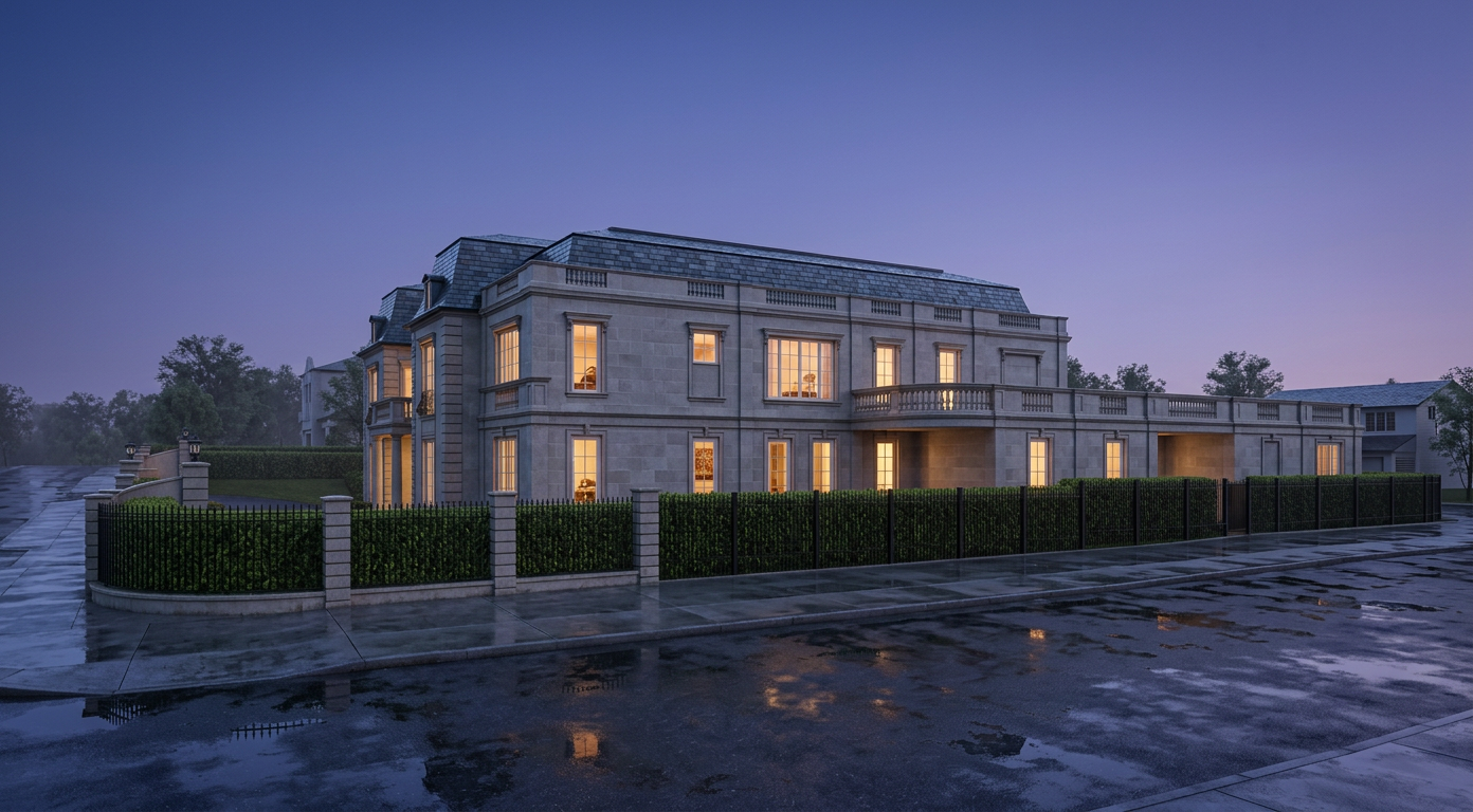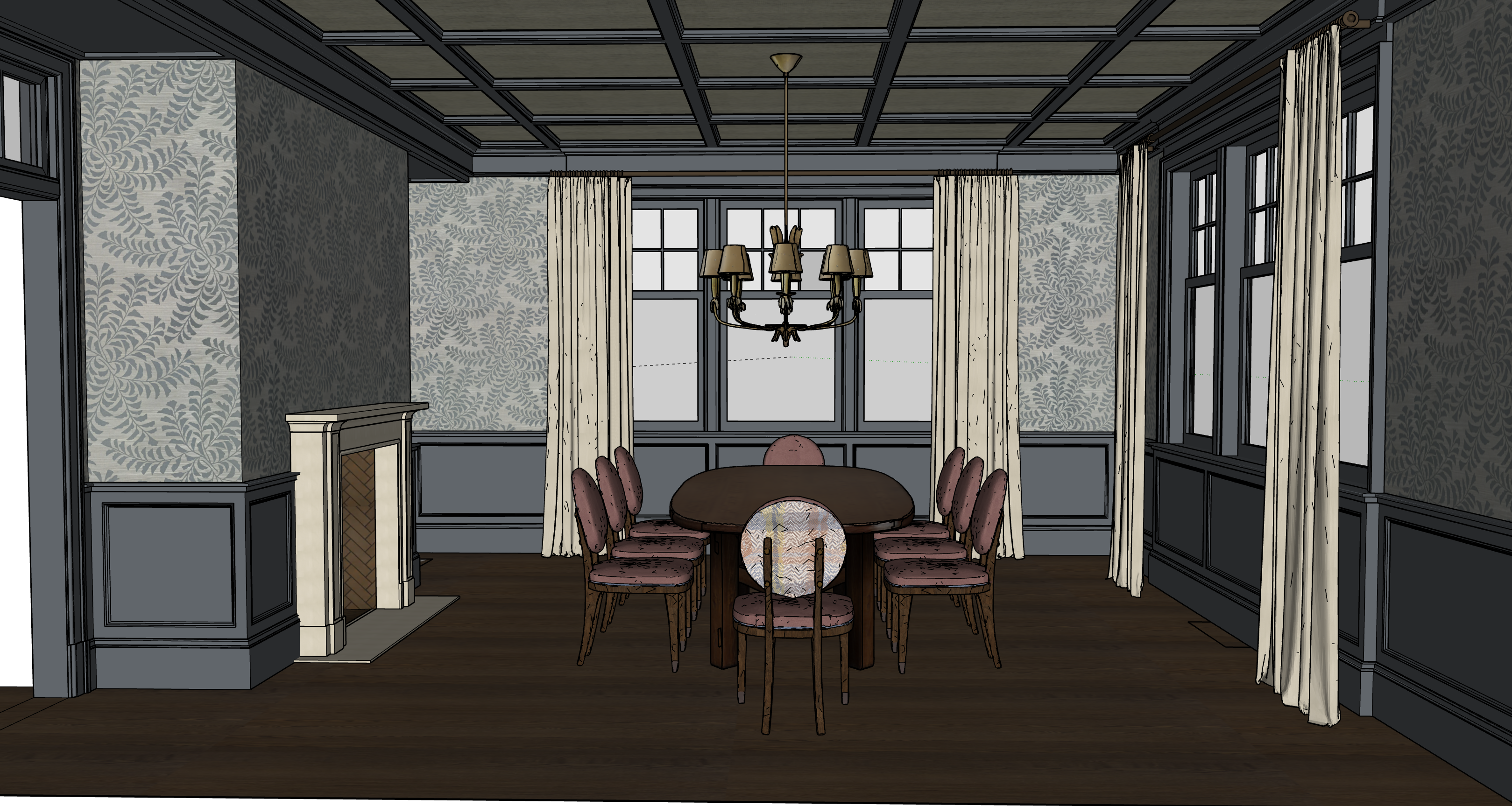 ultra photorealistic interior rendering soft diffused natural daylight coming through windows warm subtle chandelier glow realistic shadow depth cinematic interior lighting satin painted millwork textured grasscloth wallpaper aged dark oak flooring with soft natural sheen ivory wool drapery panels with heavy drape and natural folds antique brass chandelier highly detailed textures realistic fabric grain accurate architectural proportions no distortion professional architectural photography 35mm lens eye level camera balanced exposure high dynamic range