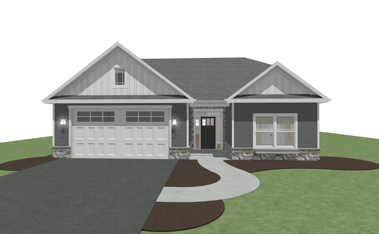 render this 3d image to appear photo realistic maintain all existing architectural materials and structural elements exactly as shown enhance the setting with a lush well maintained landscape include minimal beds manicured shrubs and a tree lined backdrop that frames the home naturally the windows should have a glossy finish with clear reflections of the surrounding trees and sky lighting should feel natural with soft shadows and realistic depth to bring the scene to life