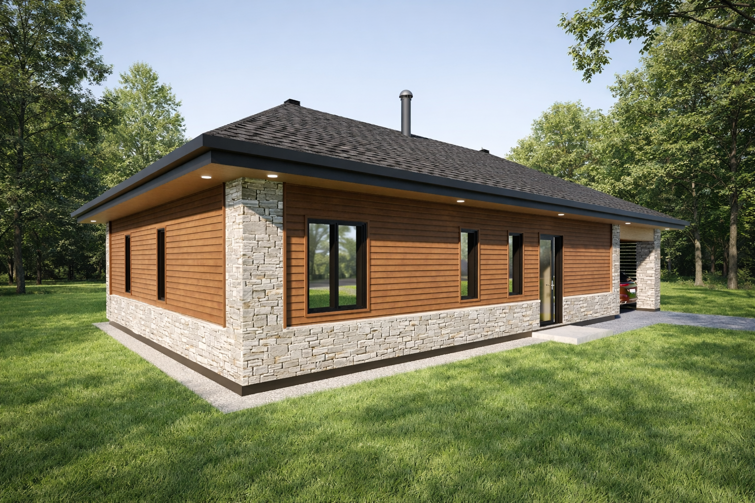 peux tu me faire un rendu r aliste avec cette image sans changer l angle de vue ni les mat riaux ni leur couleur je veux juste que tu rende le tout plus r aliste en ajoutant des arbres et du gazon je ne veux pas de paysagement autre que des arbres et du gazon je ne veux pas voir de lac reste fid le a 100 a ce qui est mod lis sur mon image donc n enl ve rien rend l enti ret de ce qui se trouve sur l image plus r aliste en suivant mes consignes assure toi que le graphisme du toit en bardeau d asphalte noir soit bien repr sent et clair fait le plus beau rendu que tu es capable avec mes consignes merci