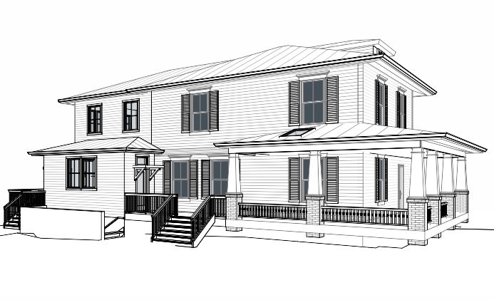 highly detailed pencil architectural rendering of a house with a shingle roof and covered front porch dark grey lap siding suggested through fine parallel line shading traditional architectural studio drawing style crisp perspective lines detailed foliage sketched in with virginia landscape plants textured graphite professional architect s hand drawn presentation black and white