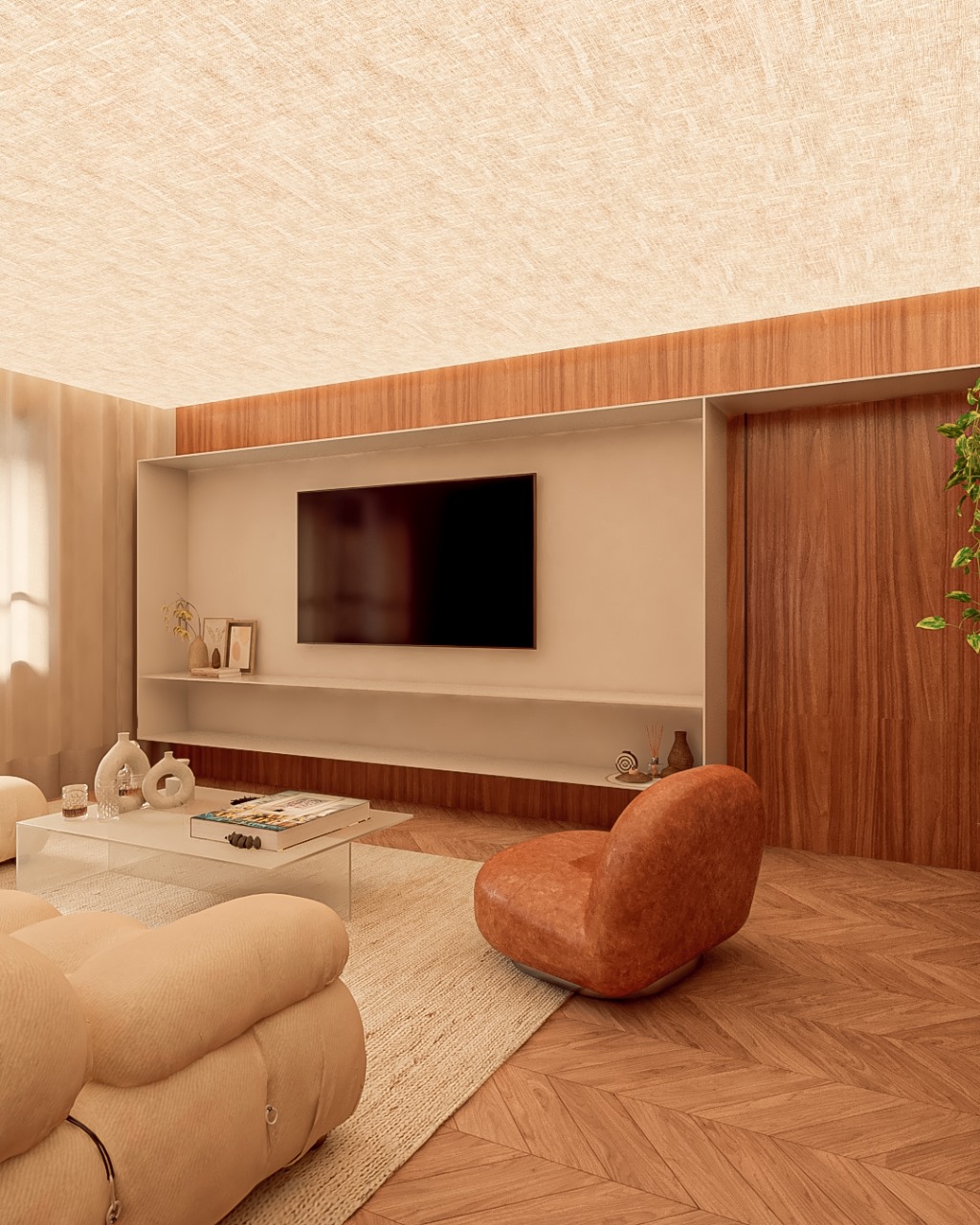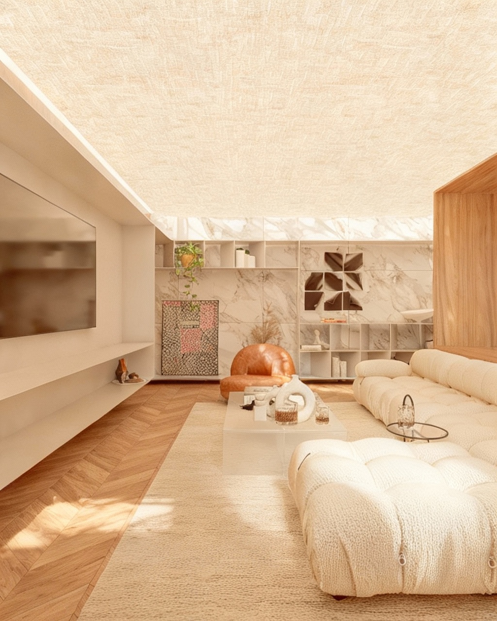 enhance realism of this interior render without changing the architecture furniture materials layout colors or composition keep the same camera angle improve natural daylight to create a sunny daytime atmosphere with soft natural shadows increase material detail realistic fabric texture on upholstery natural wood grain on the herringbone floor subtle reflections and veins on the marble surfaces and soft ambient occlusion in corners maintain a clean elegant contemporary aesthetic adjust the wooden wall panels to a lighter natural oak tone carvalho natural with a visible but subtle grain and a matte or low sheen finish keeping the overall color palette and lighting balanced without adding warmth ensure the sofa fabric is rendered as white boucle with natural fiber depth and soft shadow transitions render the armchair upholstery in caramel leather with gentle sheen realistic creases and subtle surface texture add subtle global illumination and balanced contrast for a refined and realistic finish