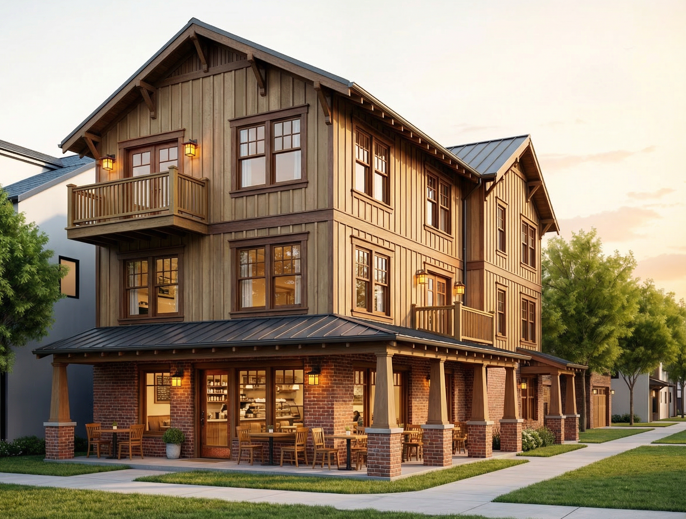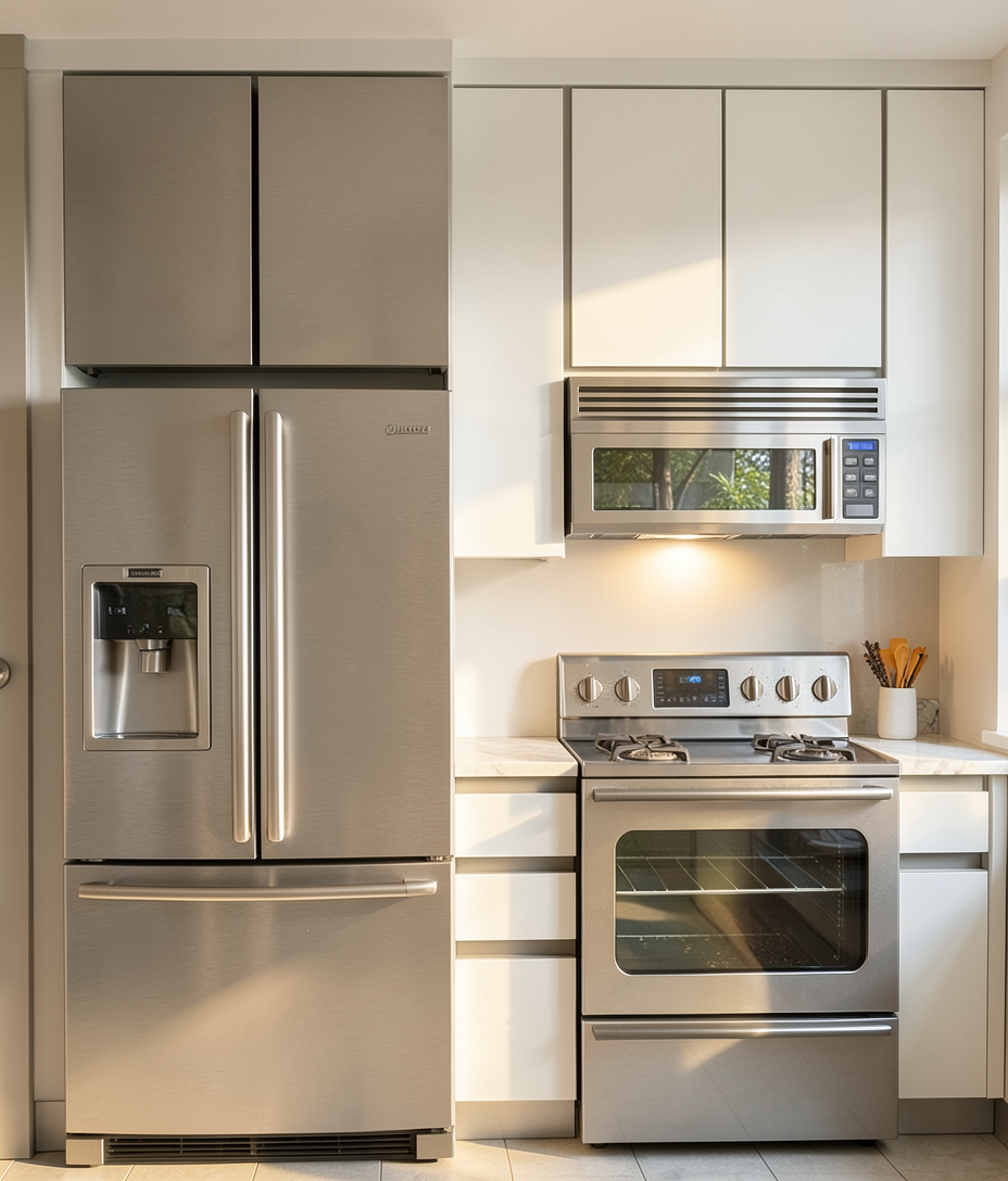 render a modern kitchen and laundry space with a serene minimalist atmosphere include light oak wood for the flooring and cabinets and a soft beige ceiling to enhance the brightness use white for the walls and a pristine white finish for the washer and dryer the countertop should be a speckled gray granite to add texture allow natural light to stream through the windows casting gentle shadows and create a clear blue sky visible through the large glass door enhancing the tranquil ambiance use warm white recessed lighting to complete the cozy inviting atmosphere