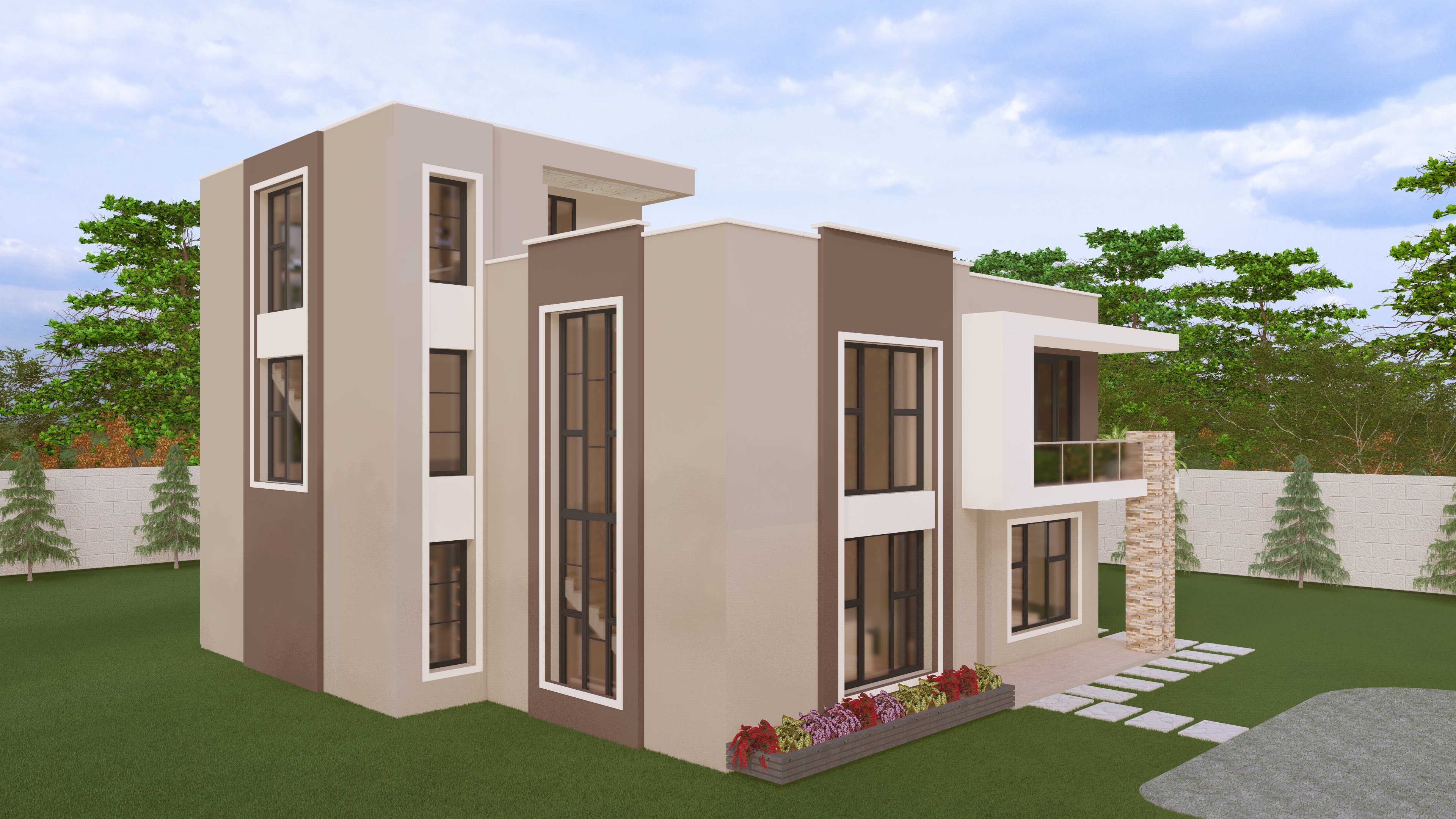 this is a modern maisonette increse texture an crispiness of the surfaces while maintaining colours add down lights and strip lights on protruding balconies even out the colours of the first and ground floor maintain daylighting no darkness whatsover