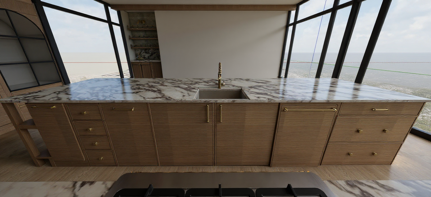enhance the scene with photorealistic materials and keep the original colors the atmosphere should be serene and inviting with a bright blue sky filled with soft fluffy clouds add low lying landscape native shrubs in green areas