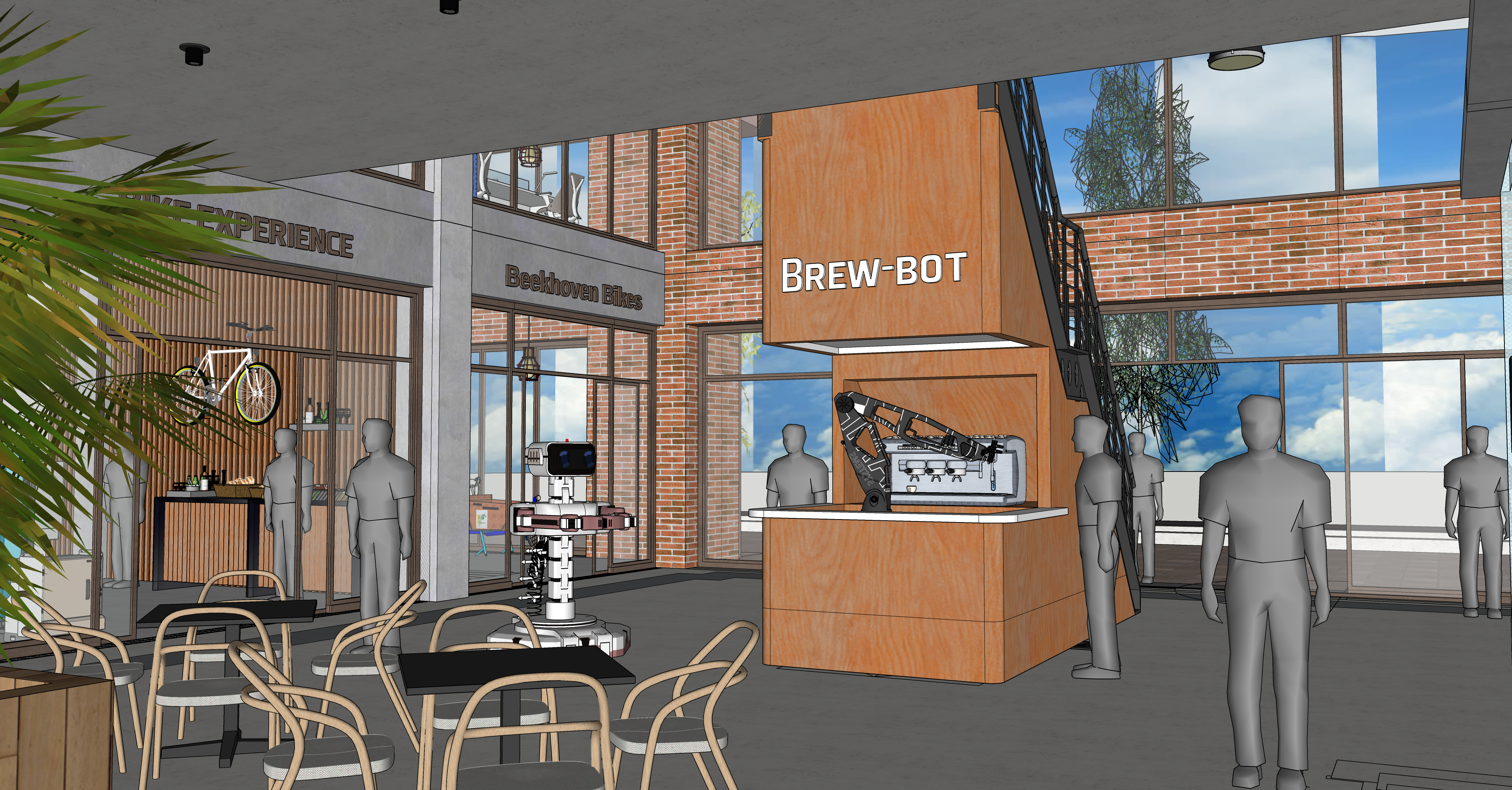 modernist interior shot modern coworking makerspace people working light colors robot arm serving coffee wooden accents warm morning light ambience architecture