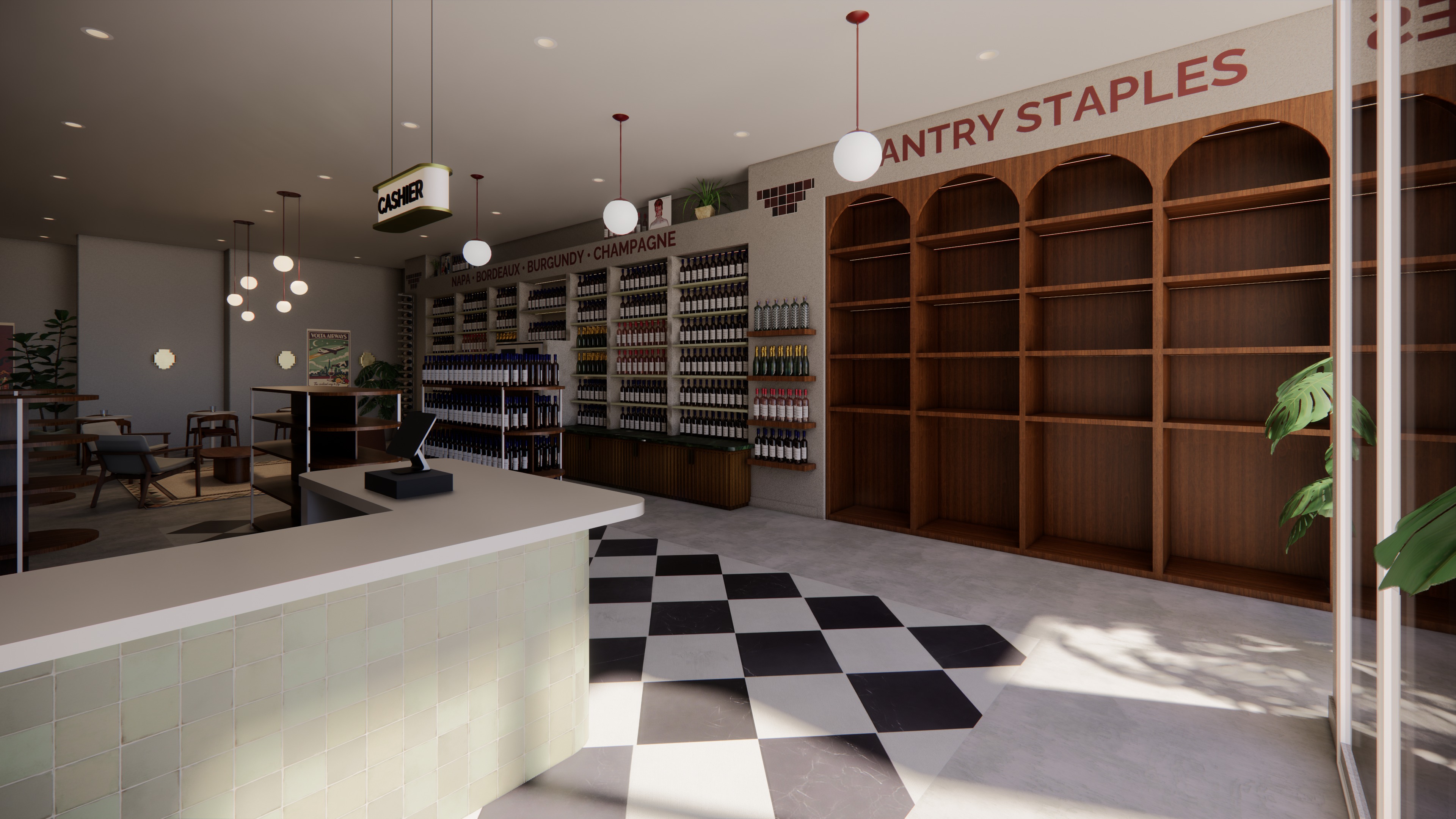 maintain everything the same maintain all geometry colors furniture placement lighting camera angle and textures add products to the wood shelves on the wall on the right add products to the oval wood retail island shelves in the background towards the middle left do not add additional shelves or retail islands style curated upscale specialty grocery italian market aesthetic organized but natural high end boutique retail merchandising populate shelves with a realistic mix of glass jars of tomato sauce and specialty sauces dried pasta in clear bags and branded boxes rice lentils farro and grains in clear packaging olive oil and vinegar bottles varied heights and glass tones canned vegetables and beans jarred olives and pickles tinned fish sardines anchovies tuna in flat tins boxes of crackers and cookies chips and savory snack bags chocolate bars and confectionery jam and preserves on the bottom shelf of the wood wall put brass buckets with dried flower arrangements packaged in elegant brown paper bouquets for retail sale merchandising direction evenly distribute products across all tiers of all four island shelves vary product heights and packaging for realism maintain clean spacing and retail symmetry but avoid overly perfect repetition keep color palette warm and complementary to the existing wood and green tones labels should be subtle and not brand dominant no floating objects all products must sit naturally on shelf surfaces