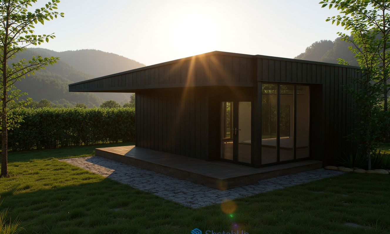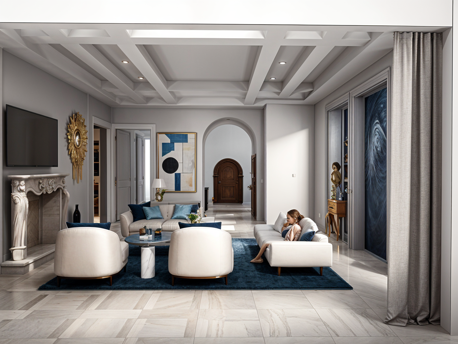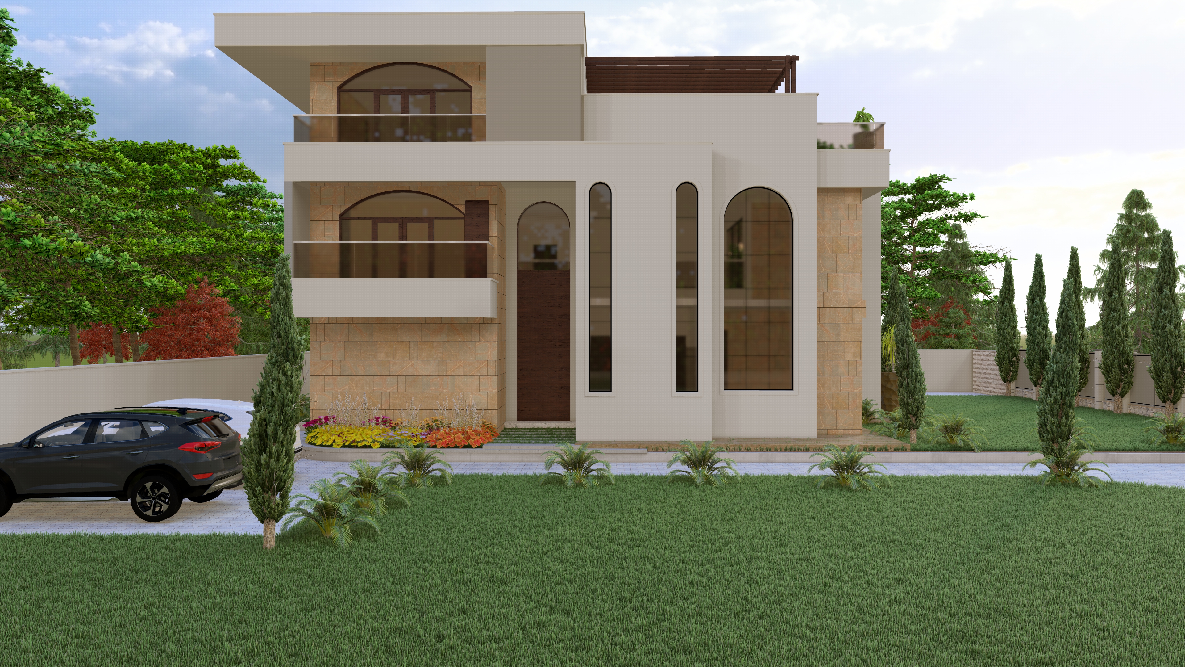 this is a modern mansion with white finished plaster surfaces and stone finished surfaces keep all materials as they are enhance texture add indoor warm lighting brighten the scene with daylight