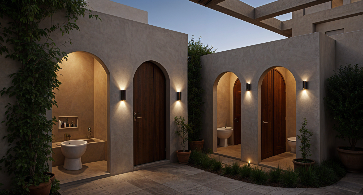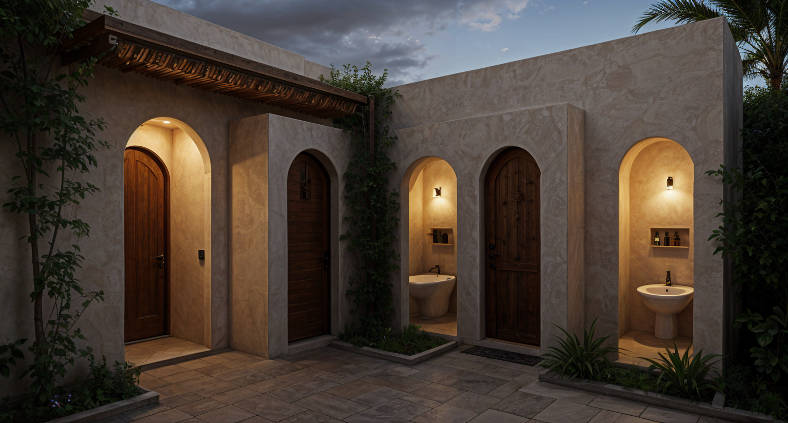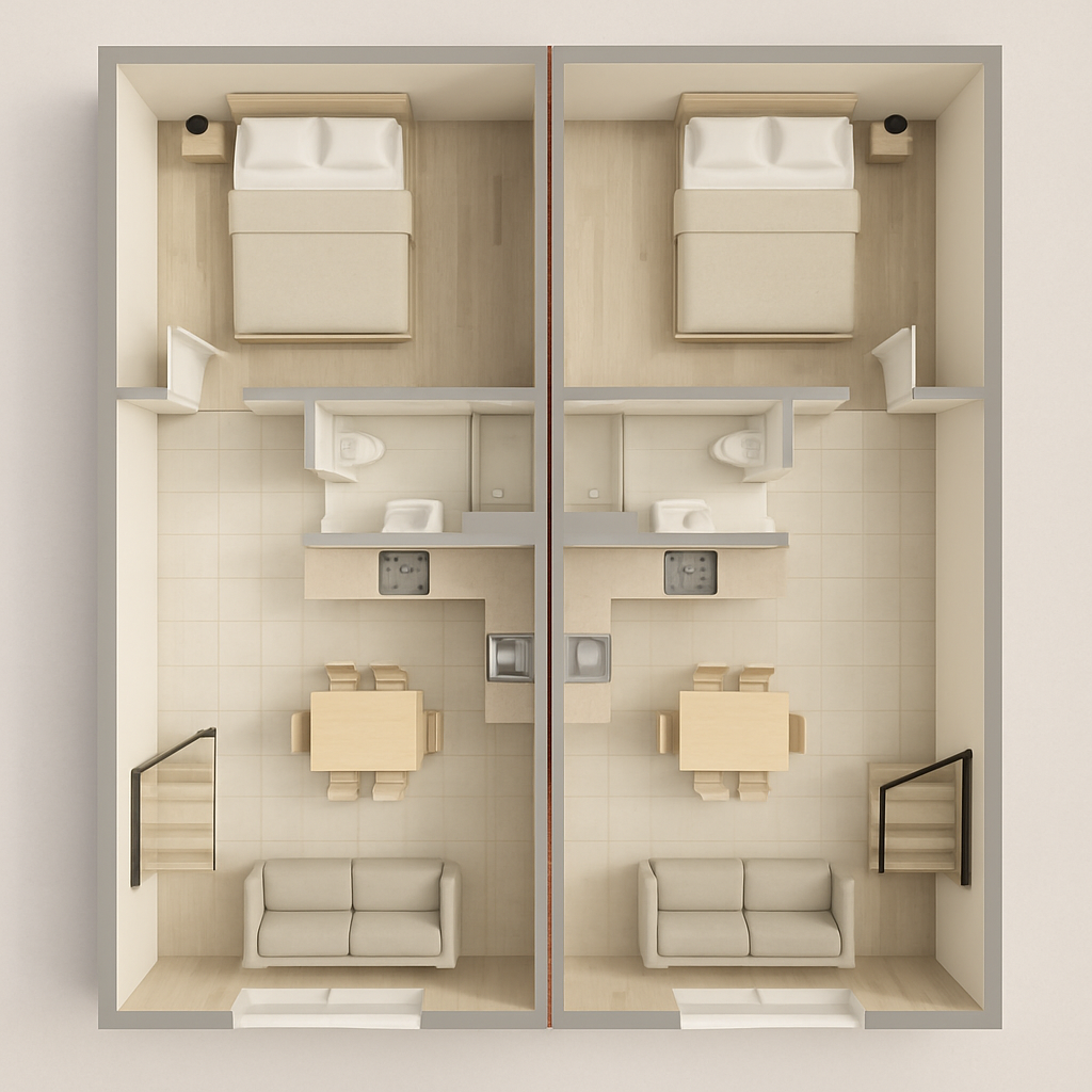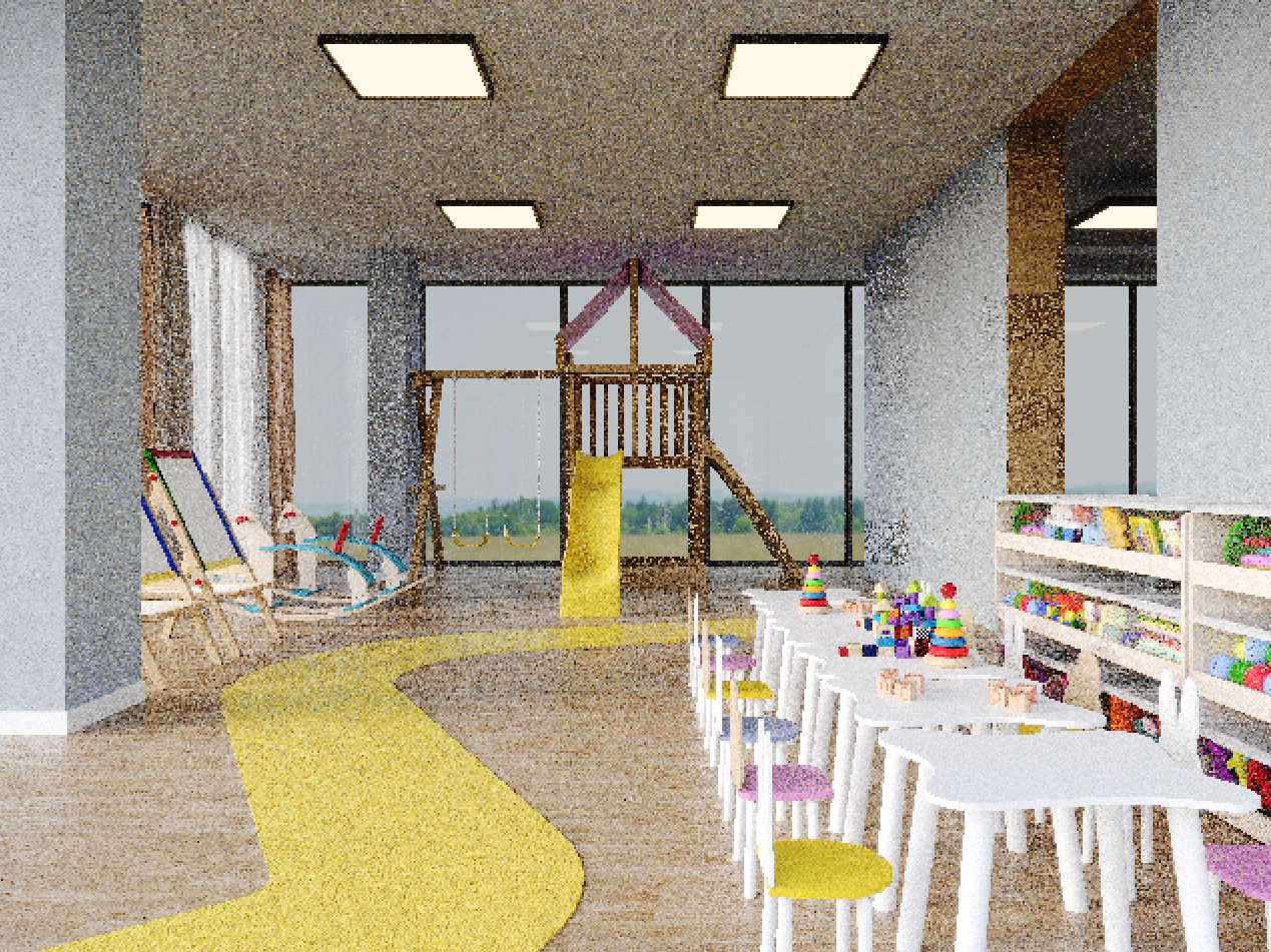 playground for kids yellow track on the ground that serves for riding small bikes there are tables for the kids on the site for playing in center there is a wooden installation that serves for kids to play with 2 swings on the left a slide in the center and small climbing wall on the right on the left part of the room there are painting tables as well and next to them are wooden small riding horses warm tones all around architecture