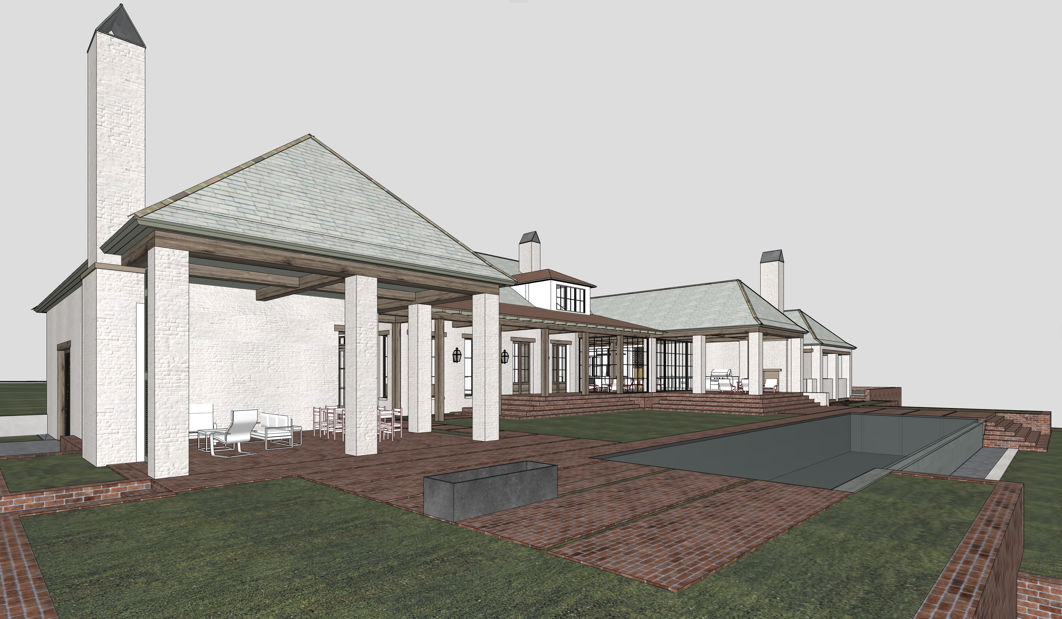 white lime washed brick manicured grass in the foreground slate roof lake and trees in the background to the right