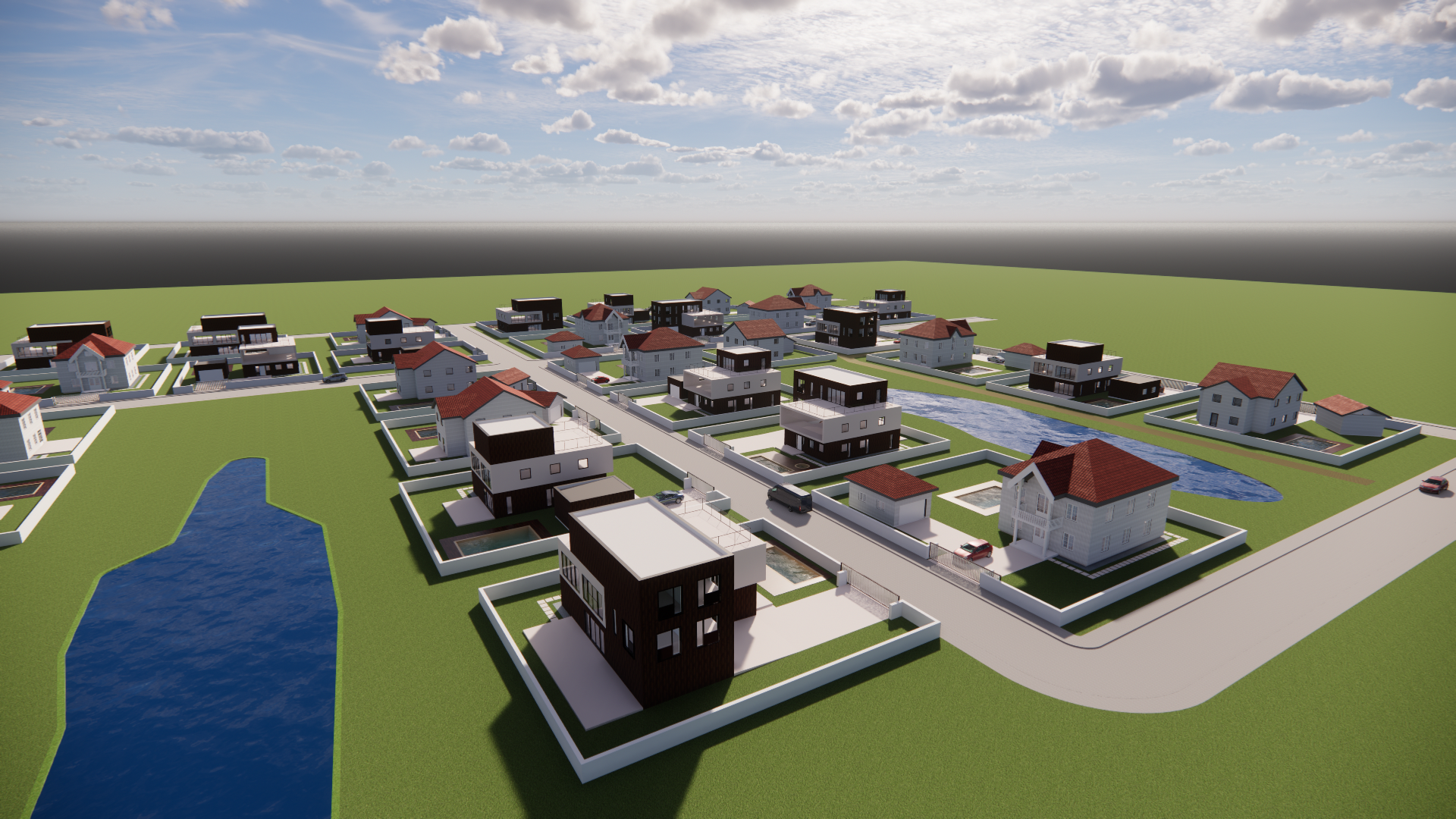 render a serene suburban neighborhood under a clear blue sky with soft fluffy white clouds the atmosphere is peaceful and sunny houses feature modern architecture combining white walls with rich brown accents and vivid red roofs manicured green lawns surround the properties with sleek white fencing add congo forest and mountains in the background add a shimmering blue pond mirroring the sky and a winding gray road with neatly parked cars ensure the lighting captures a warm late afternoon glow casting gentle shadows for a picturesque scene