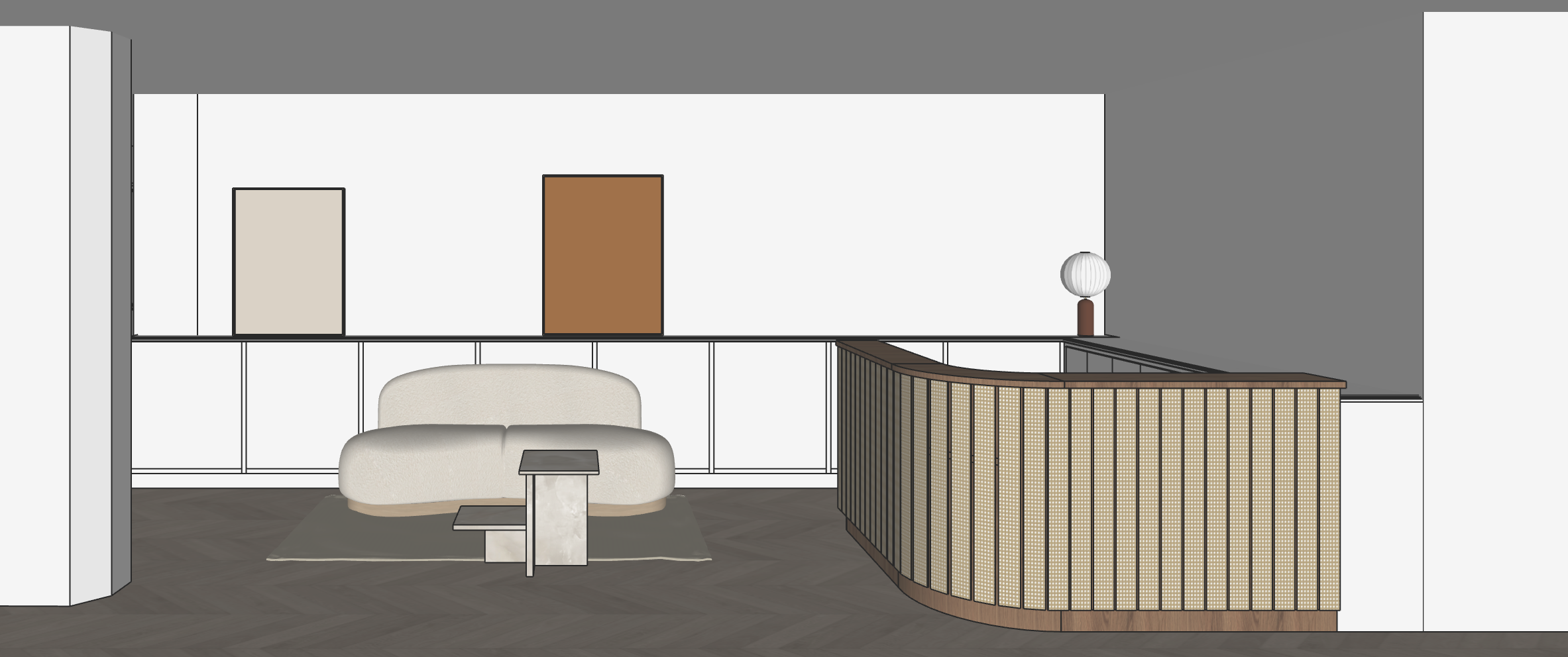 light parquet oak matte wall painted whith soft moulure white lighiting warm sun