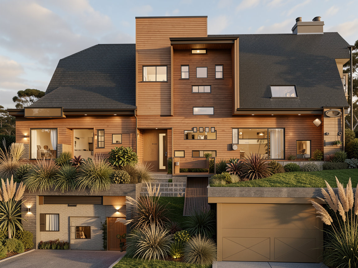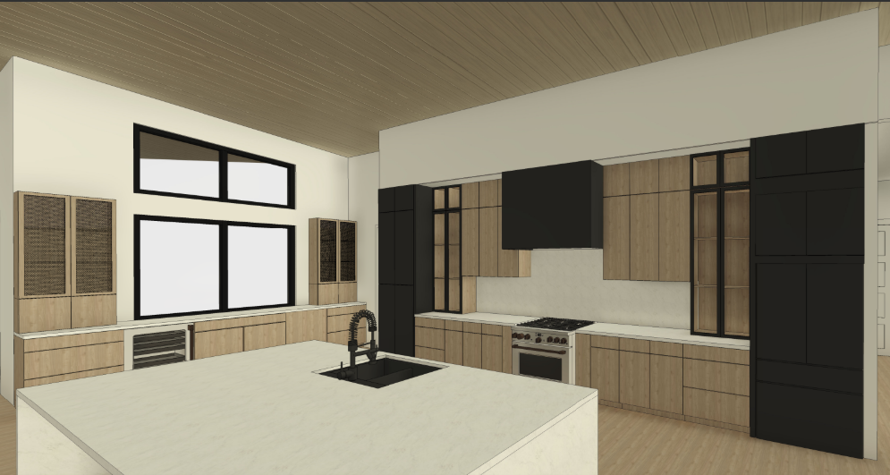 realistic architectural interior rendering in natural daylight preserve all existing architectural elements exactly as shown do not add remove or reposition any structural components cabinetry layout appliances or fixtures unless explicitly stated below countertops two countertop sections only one to the left of the oven and one on the island the hood surround is finished in the same material material calacatta gold beige marble with very fine thin naturally blending veins soft and organic not bold or graphic no thick or marker like veining cabinetry all light wood cabinetry and flooring renders as light neutral oak neutral tone not warm not yellow or orange natural straight grain cabinets surrounding and flanking the hood must be wood oak not black all exterior facing black cabinets render in matte black no sheen or gloss left window cabinets fluted glass door detail the tall cabinets directly flanking the windows on the left wall must have door fronts featuring vertical reeded fluted glass panels set within a flat oak frame the glass is clear with tight evenly spaced vertical ribbing the flutes are narrow cylindrical and run floor to ceiling of the door panel flute width approximately 8 12mm densely packed with no flat gap between ribs the glass is semi transparent objects inside the cabinet stacked plates minimal decor are softly visible but diffused through the reeding the oak frame cabinet body proportions and all surrounding elements remain exactly as shown only the door insert changes to this fluted glass detail no hardware on any cabinets no knobs no pulls styling details interior of left side cabinets stacked plates and minimal decorative objects softly visible through the fluted glass island surface one small potted plant and one fruit bowl no pendant lighting added atmosphere realistic natural daylight windows show lush green trees and clear blue sky no artificial lighting do not add any furniture fixtures d cor or architectural elements beyond what is described above do not add cabinets do not add hardware