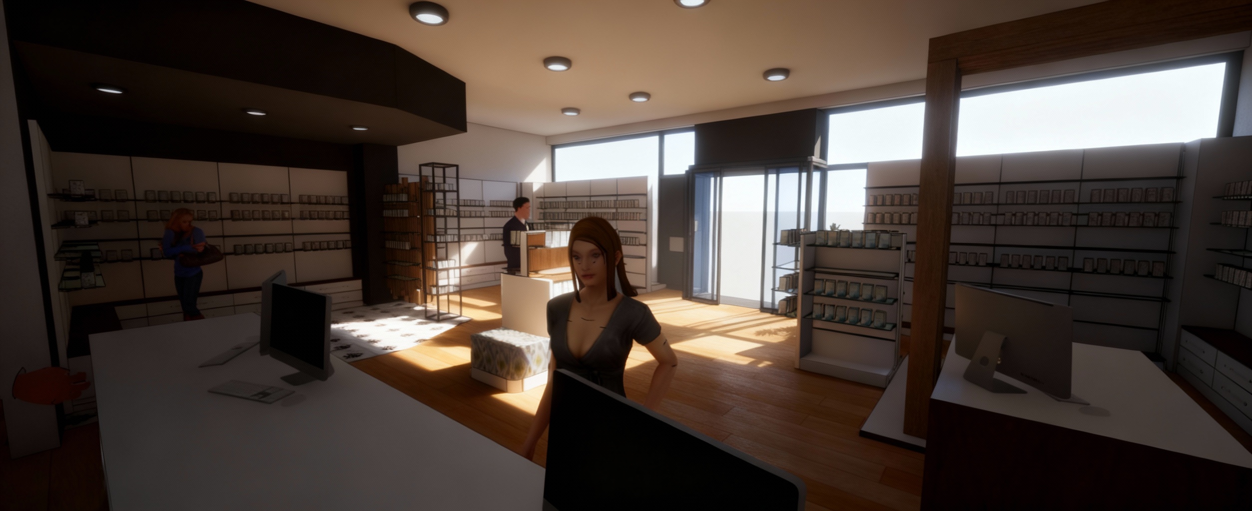 le plafond est fait avec un flocage et une gaine de a ration type usine tout en rouge a droite au bar c est un effet roche gris clair pas trop accentu avec une bande led le sol plancher bois fonc vertical des personnes en train de manger du ramen par la fenetre on voti un trottoir et une rue ajoute des chefs en en tain de faire des ramens le sol est en bois marron fonc