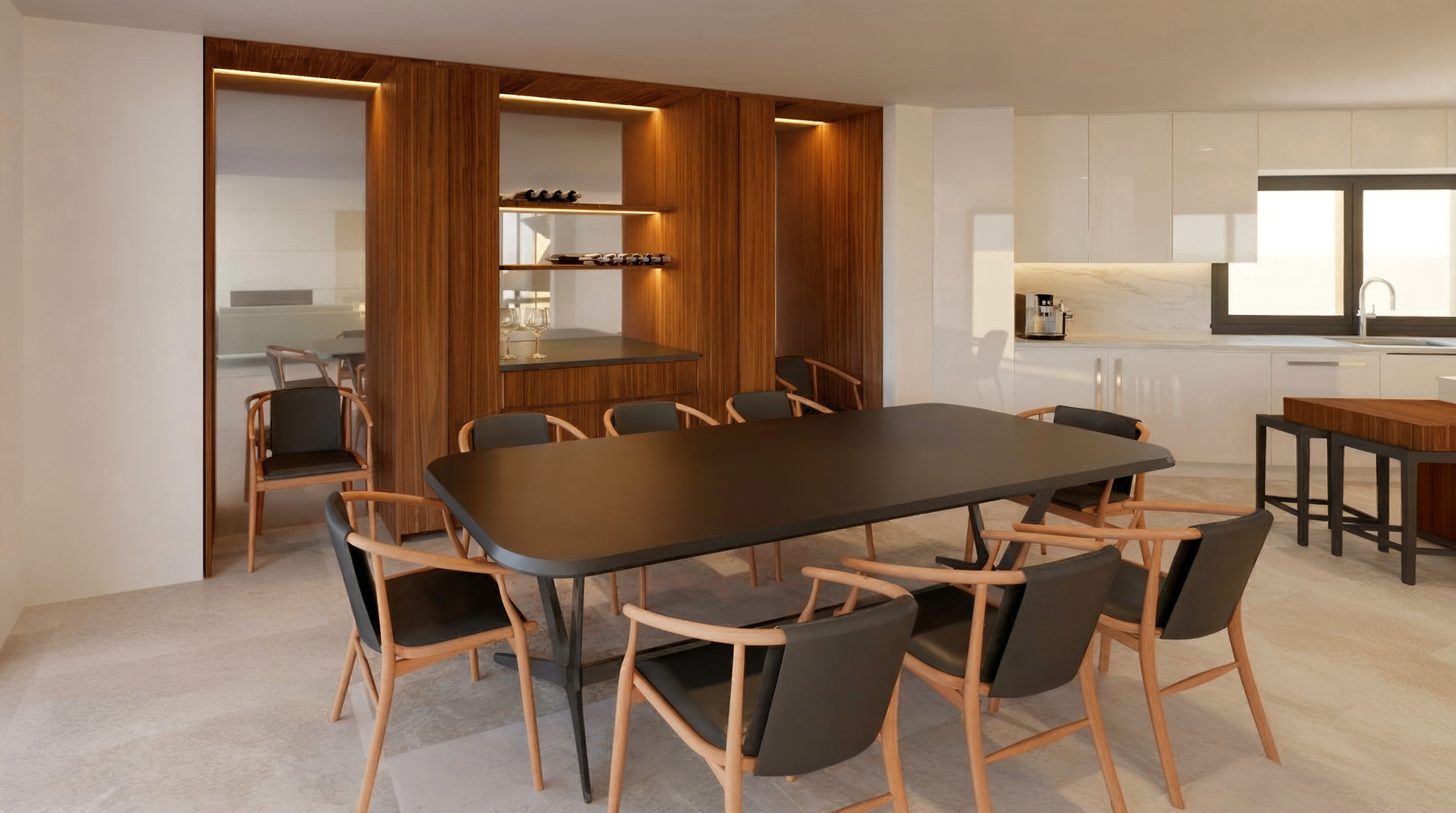 create a modern dining room and adjacent kitchen featuring a spacious walnut table surrounded by elegant walnut chairs with black leather cushions the atmosphere is warm and inviting enhanced by rich walnut and glass cabinetry and there is an ocean view reflected in the glass mirror incorporate white walls and a light marble backsplash in the kitchen the kitchen cabinets are a white satin finish and color add a large window with black frames to allow natural light to flood in and add trees in the window creating a bright airy feel the floor is light stone tile complementing the neutral palette