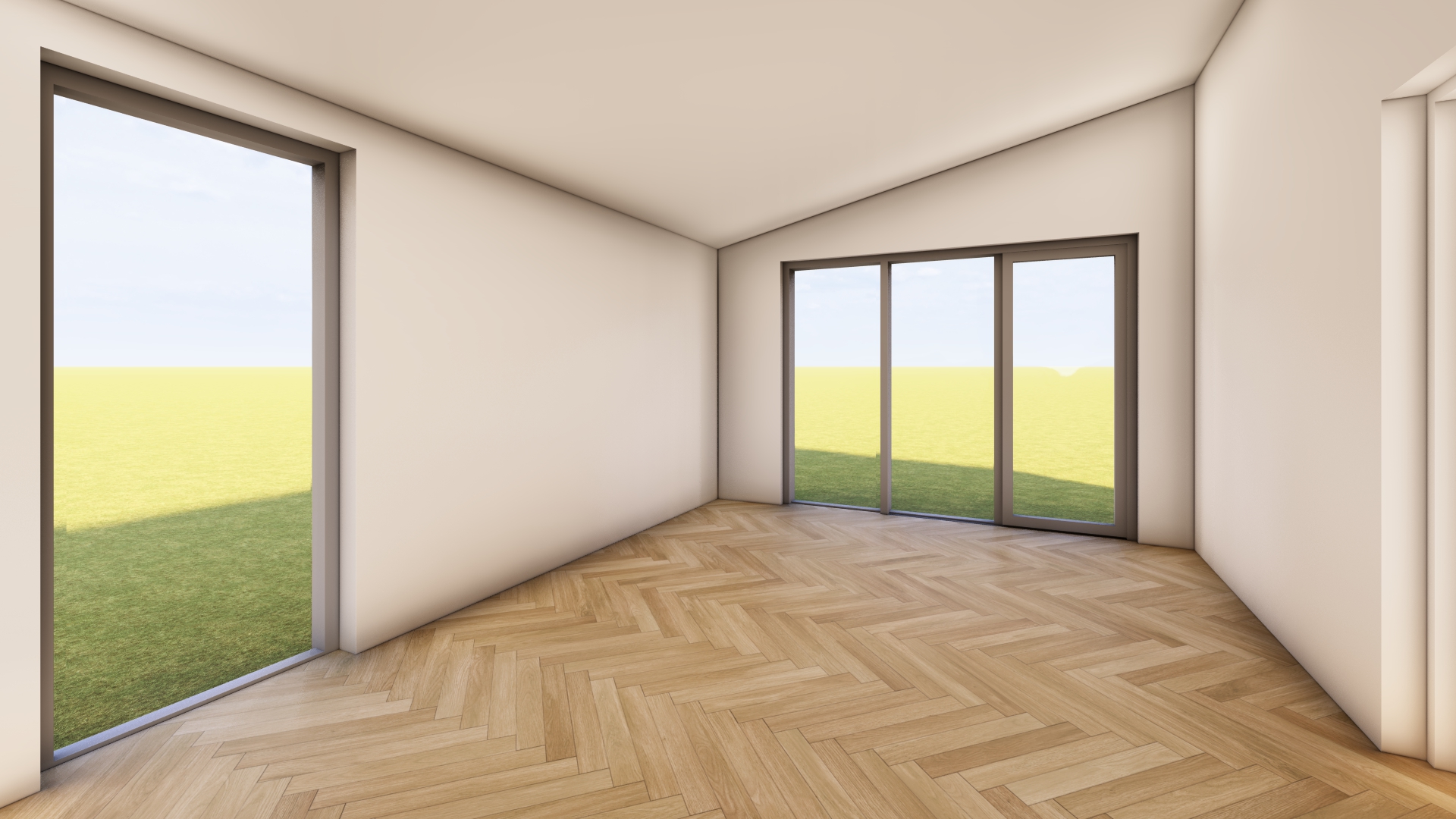 links een keukenblok modern kleur wit plint keukenblok grijs geen bovenkasten deze is niet in de muur ingebouwd maar staat dus tegen de muur aan ook een moderne strakke eettafel toevoegen uitzicht op veel groen met bomen bloemen en een kleine moestuin