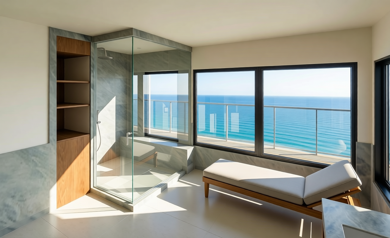 tan stone veneer gray slate roof cream stucco tan fascia and gutters on hillside