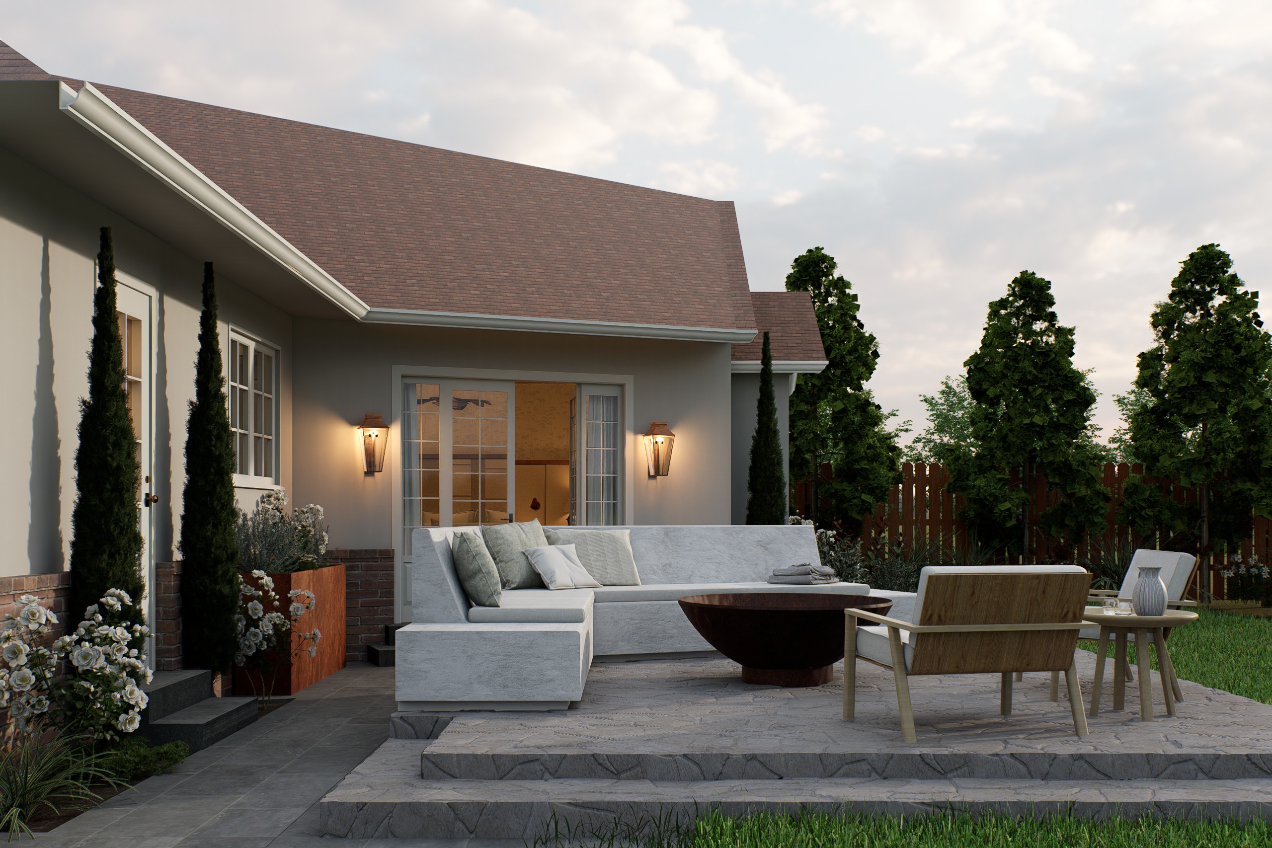 keep the image exactly the same do not change the design layout furniture landscaping layout or composition improve overall photorealism by refining lighting materials and surface behavior only adjust lighting to feel like soft natural early evening light with balanced exposure reduce any flat or dull areas and introduce subtle contrast with gentle shadow transitions add realistic ambient bounce light so surfaces feel grounded and naturally illuminated the wall sconces should emit a soft warm glow that subtly affects nearby surfaces without overpowering the scene refine all materials to behave more realistically the plaster seating should have subtle tonal variation slight surface irregularities and softly rounded edges instead of sharp geometry the stone platform and steps should show natural variation in color roughness and edge wear avoiding uniform or repeating textures the wood furniture should have richer grain detail slight variation in tone and a more natural matte finish the fabric cushions should appear softer with slight creasing compression and realistic light absorption improve glass reflections on the doors and windows so they are subtle and consistent with the outdoor environment not overly sharp or artificial refine landscaping materials without changing placement plants and trees should have more natural variation in color density and softness with slightly less uniform edges slightly soften the background trees and sky with a subtle depth of field so they blend naturally with the scene avoid a cgi look materials should feel slightly imperfect soft and naturally lit like a real photograph do not add remove or restyle any objects or plants