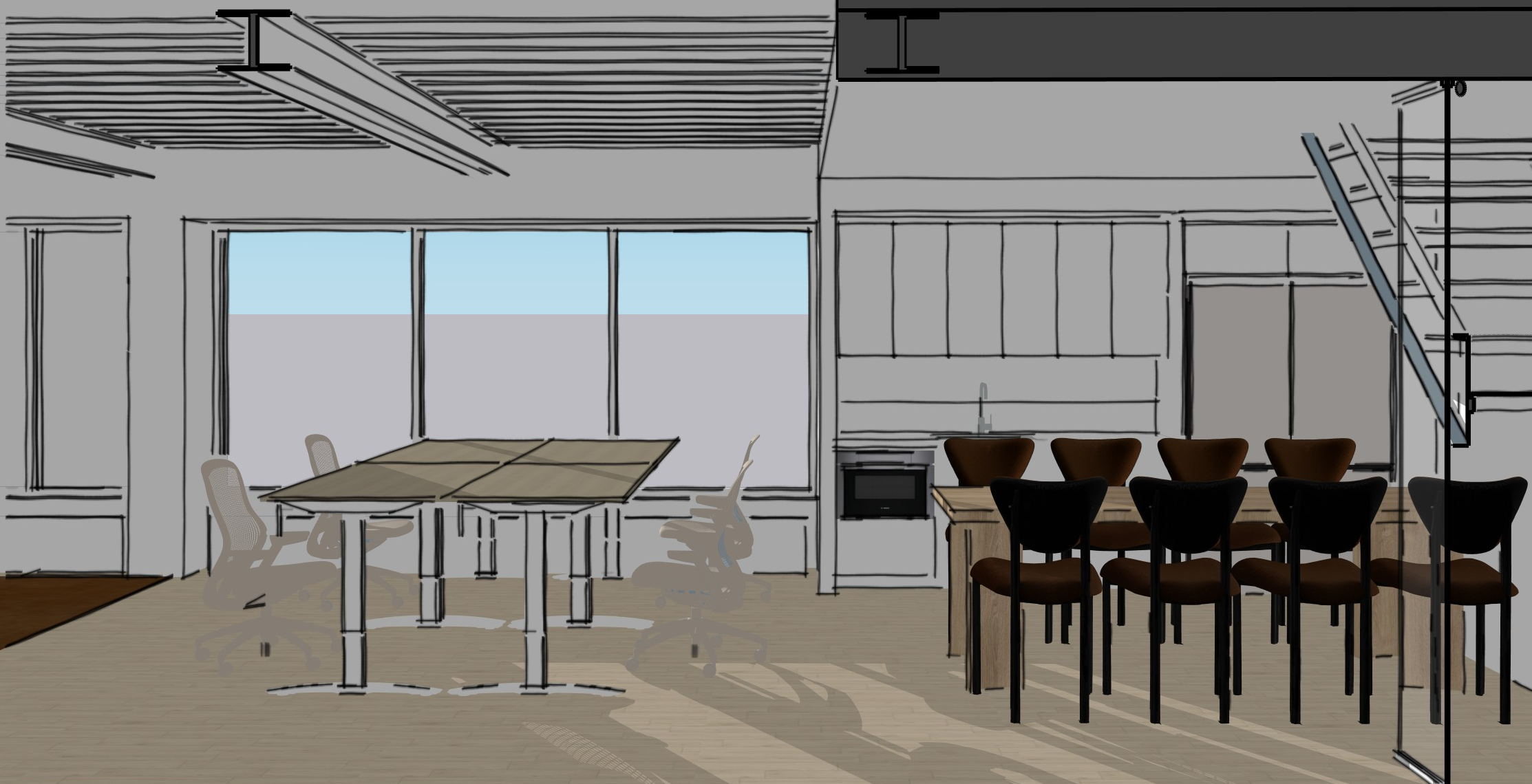ceilings should be white windows should have white mullion window view should be the city skyline desk chairs should be a cream color