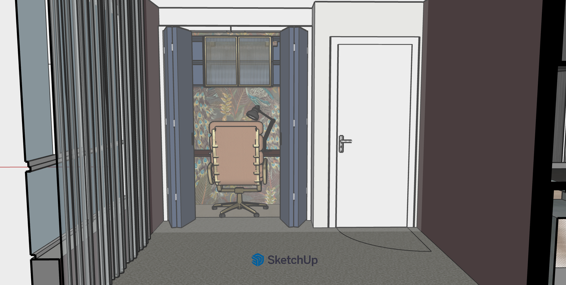 create a realistic render of this image for an interior design client add a simple ceiling add lighting sheer soft curtains soft grey beige carpet over the entire floor throughout remove the text make the bi fold office doors walnut add in lighting in the office keep the wall colour the spiced mushroom colour as per the original image