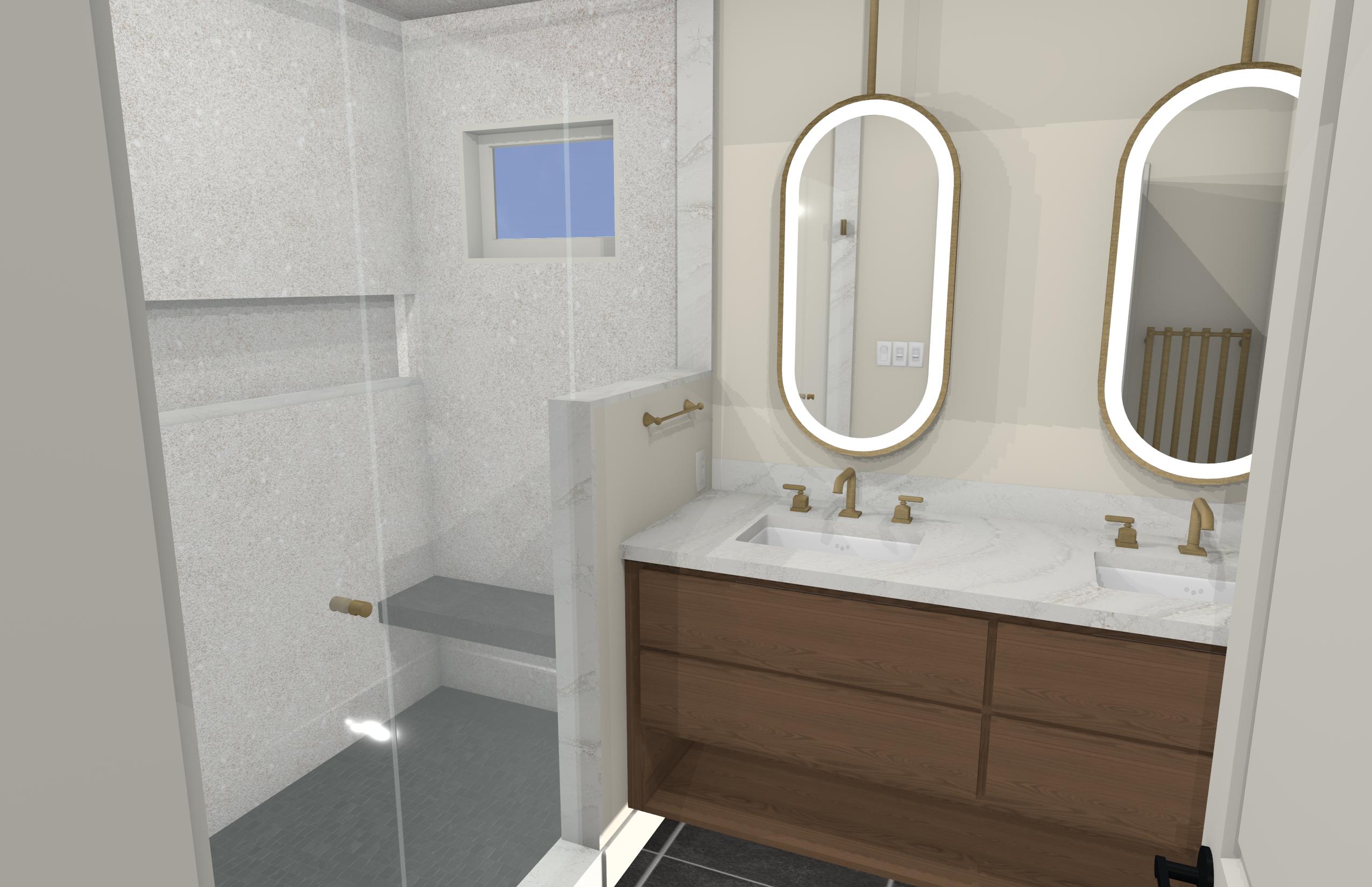 bring life to this rendering with elegant details that fit the feeling of a serene primary bathroom in the morning on the vanity countertop add simple elements like soap a cup with toothbrushes a hand towel on the towel bar above the outlet and towels folded and stacked along the bottom shelf of the vanity add a small white hand towel on the towel bar of the pony wall in the shower niche add simple shower toiletries wall white shampoo and conditioner bottles and a small plant the only natural light is coming from the original window in the shower do not change any other elements keep the drawers the same size as the original photo add more towels in the bottom shelf of the vanity