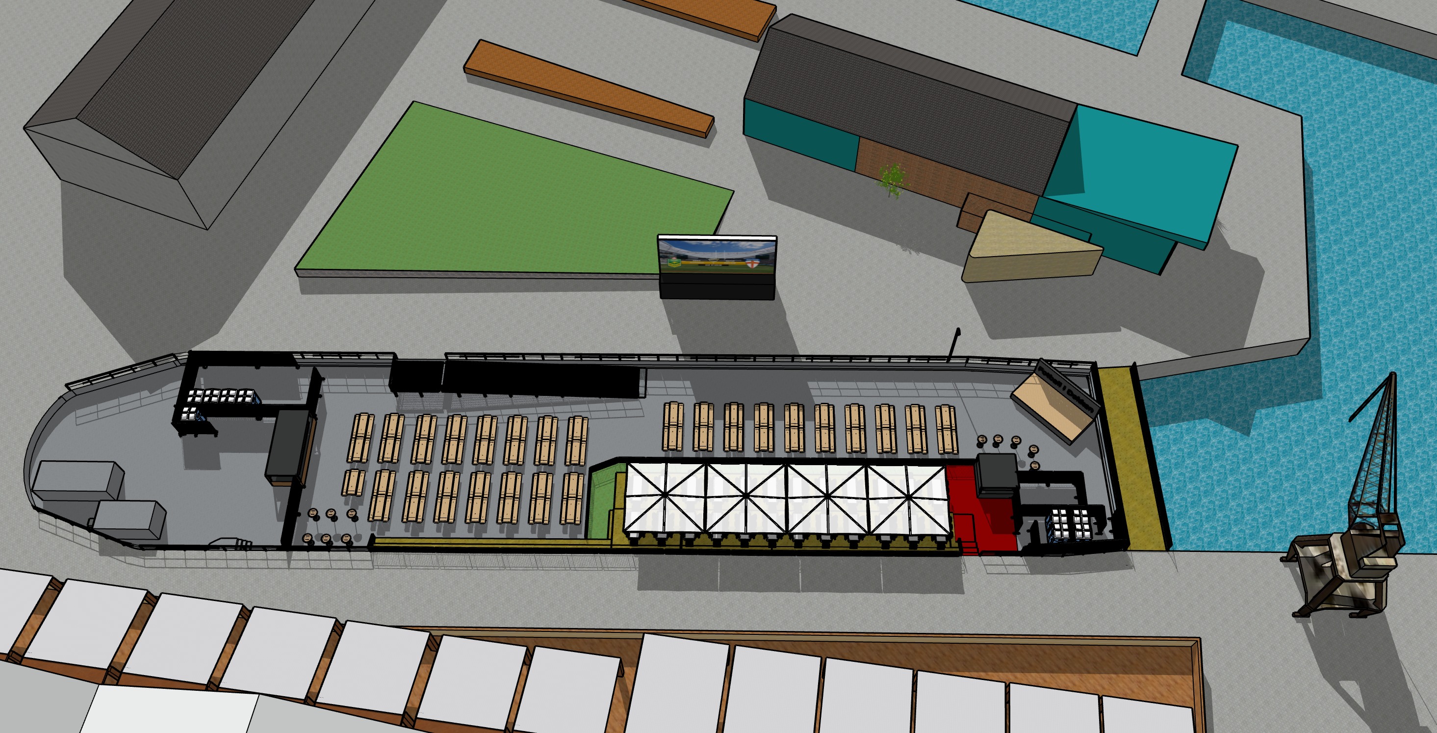 photorealistic architectural visualization of the provided sketchup model absolute rules must follow do not change geometry in any way do not move resize rotate or replace any object do not add or remove anything keep exact layout proportions and positions maintain original camera angle and composition no people no crowds no silhouettes no new lighting fixtures no decorative lights no festoon string lights no new railings fences bollards planters trees or vegetation do not improve by redesigning the site material locks very important the pedestrian bridge between the stage area and the crane must be wood decking natural scandinavian timber the green area must stay a simple flat surface in the same shape and size as in the sketchup image do not turn it into a football pitch no field lines no circles no markings no goals keep the existing surfaces and colors consistent with the original model grey paved ground remains grey paved ground black structures remain black white tent remains white what you are allowed to do improve textures realism lighting and shadows only add subtle material detail concrete texture wood grain metal finish without changing shapes clean professional archviz look for sponsor presentation lighting soft natural daylight or mild golden hour light no dramatic cinematic glow no extra spotlights added no exaggerated reflections render style photorealistic clean sharp realistic materials realistic shadows high detail no stylization no artistic interpretation negativ prompt viktig lime inn football pitch markings field lines soccer field grass texture added decorative lighting string lights extra lamps extra railings extra fences extra vegetation redesign new furniture new buildings water changes reflections exaggeration distortion warped geometry changed tent shape changed bench layout changed screen position