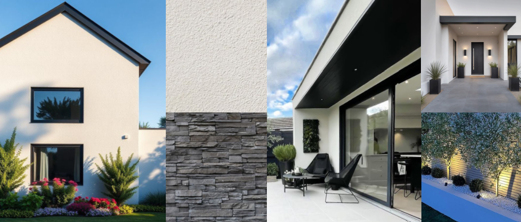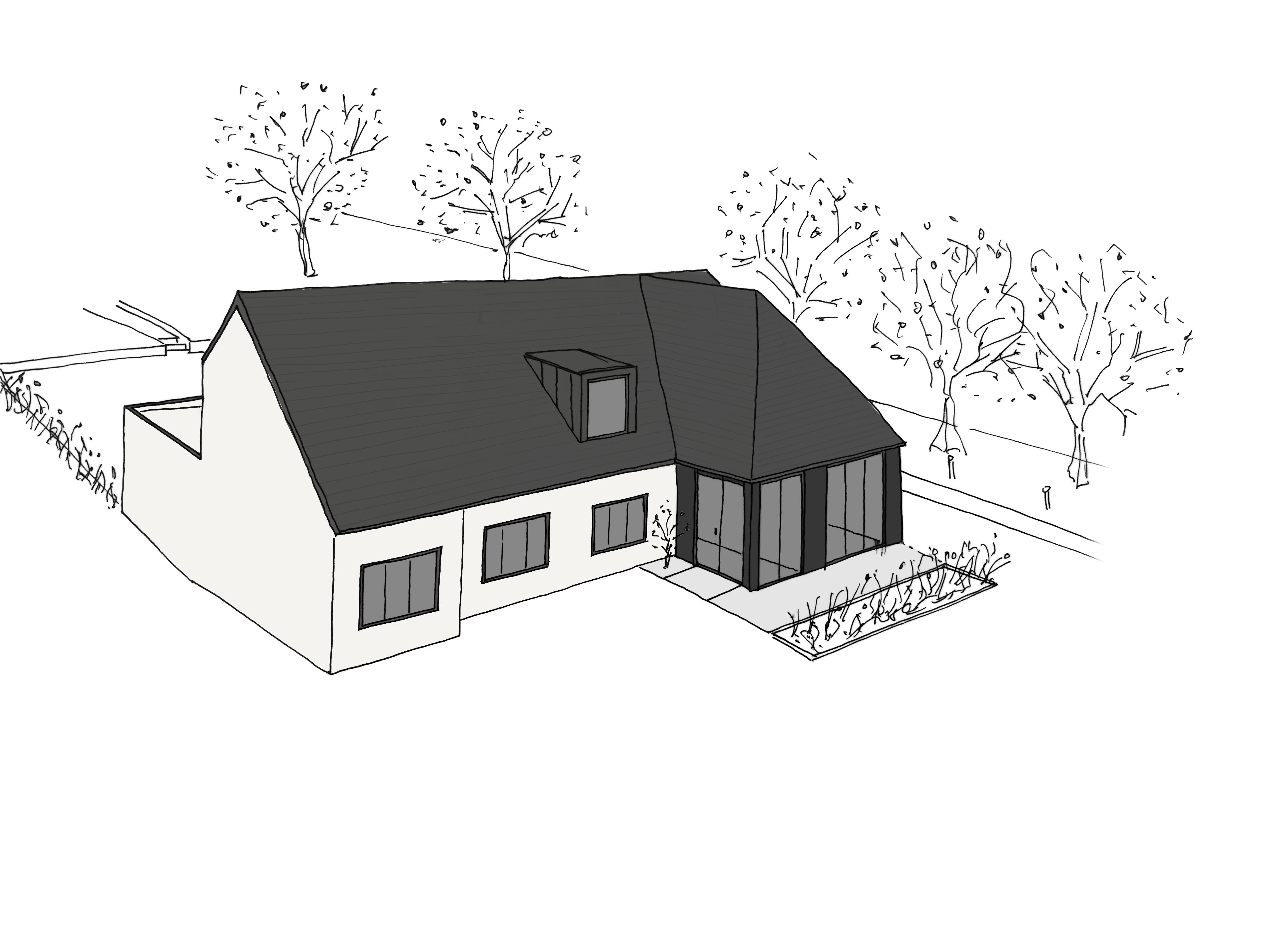 exterior shot white render to exterior walls dark grey natural slate roof dark grey black window frames east facing view in ireland