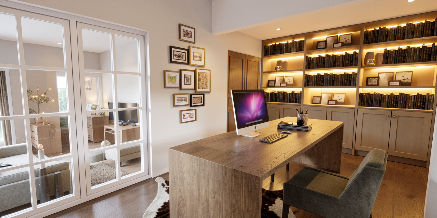 render of 3d model turn on lights in the book shelves indoor window looking into the living room also render the living room like the model