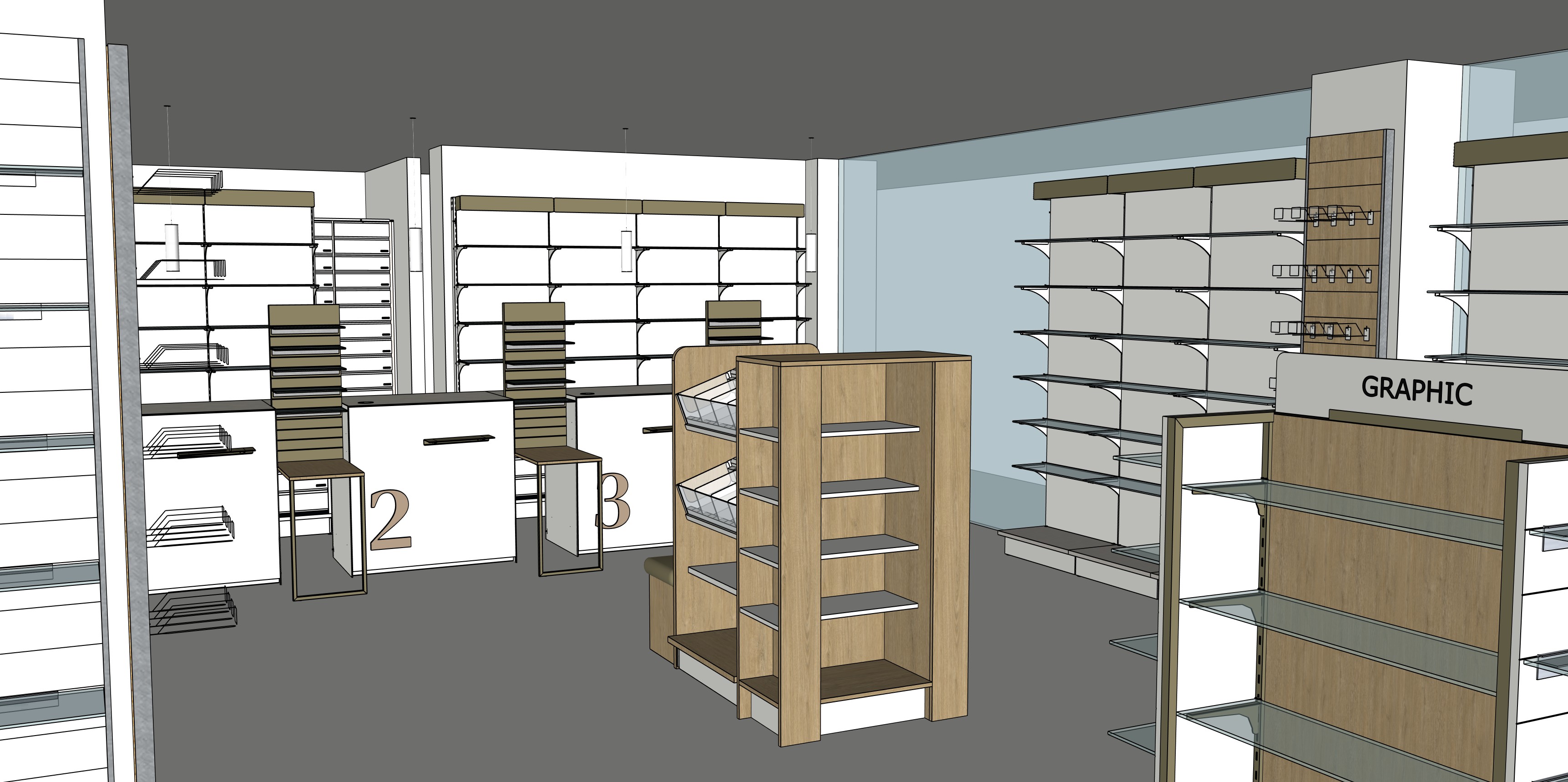 inserisci i prodotti sugli scaffali e fai un illuminazione adeguata posizionando dei faretti a soffitto e mettendo come pavimento un parquet di rovere chiaro a listelli grandi posizionati lungo lato lungo del locale