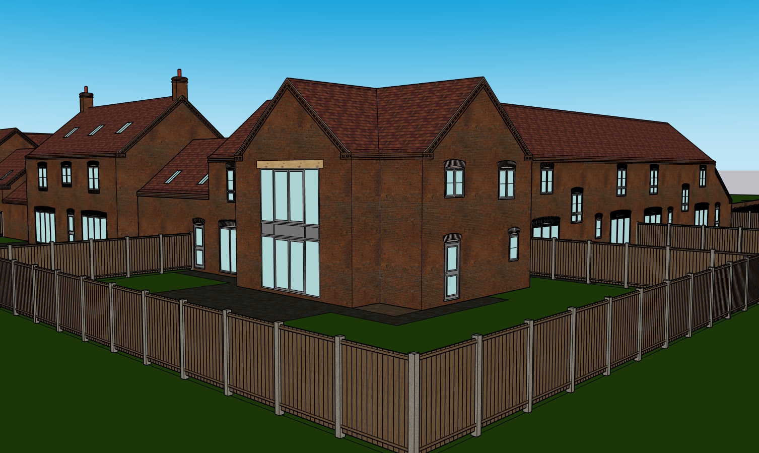 maintain geometry red double pan roof tiles light grey doors and windows afternoon glow light cloudy sky