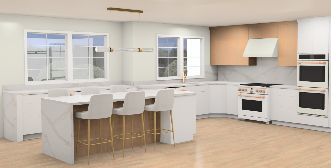 recessed lights in the ceiling the handles of all appliances are gold the walls are white