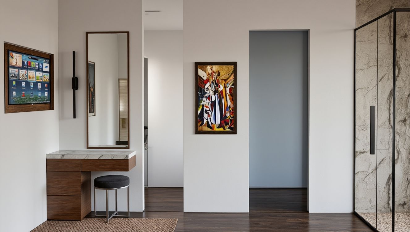 the flooring is a black stained concrete that is modern the high end vibe is like a luxury hotel there is a closet next to the vanity filled with luxury clothing the other door that is nearest the shower has a view to the beautiful pool from a floor to ceiling window that is in the bedroom beyond the gorgeous shower has a frameless clear glass the rug on the floor under the vanity is a shinny copper penny tile