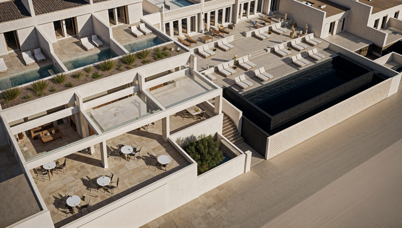 create a cozy and inviting living room scene with a warm rustic atmosphere feature a stone textured wall in light beige tones adding depth and character include three elegant tall bookshelves one in muted terracotta with dark interiors one in pure white with natural wood back panels and one in soft beige with reflective glass doors for a touch of modernity add decorative elements on the shelves such as art sculptures books and small clocks the flooring is a charcoal gray slate tile to ground the space maintain a balance of shadows and light to create a serene and harmonious atmosphere the right furniture is terracota red uni