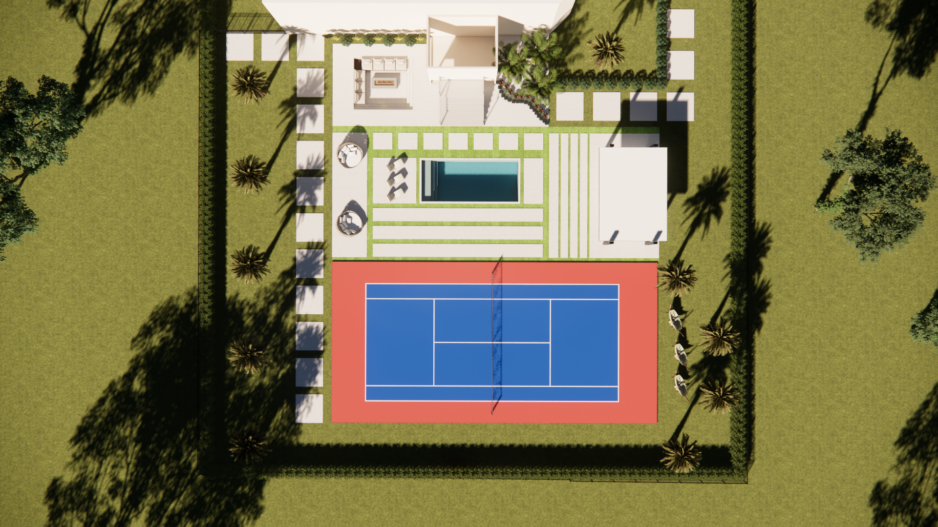 create a highly realistic photorealistic rendering of this backyard design maintain the exact layout geometry and proportions do not modify the house pool tennis court or pathways enhance materials with real world textures natural stone or light travertine for walkways clean realistic grass with subtle variation detailed water in the pool with reflections and depth tennis court with professional surface texture and slight wear upgrade landscaping with a luxury refined look add realistic palm trees and soft well balanced planting keep a clean modern high end aesthetic not tropical overgrown improve shadows and depth in vegetation lighting use soft natural daylight late afternoon or golden hour add realistic shadows ambient occlusion and light bounce camera keep top view but slightly refined true orthographic feel with subtle depth high resolution sharp architectural visualization quality overall style ultra realistic luxury outdoor design clean and elegant no changes to design only visual enhancement