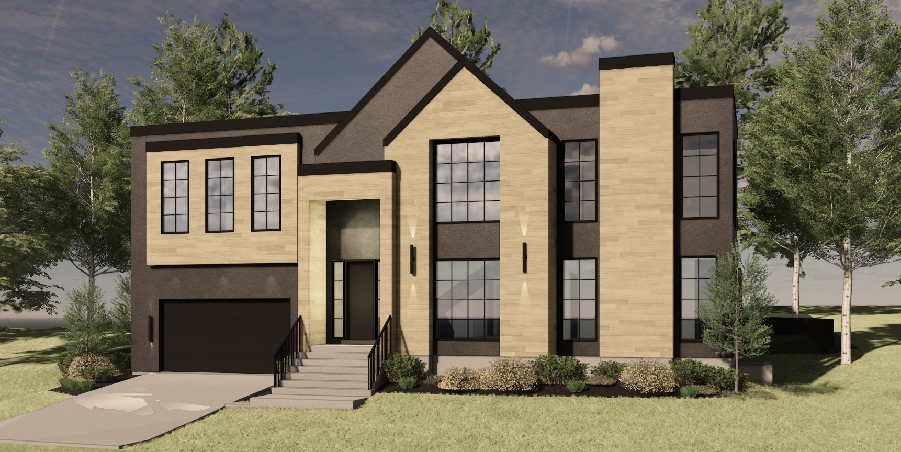 exterior shot this is a modern house with black stucco and warm light wood horizontal siding the image is taken just after a rainstorm and has beautiful realistic grass and landscaping that make the home feel majestic and the sky is overcast and the time of day is about 6pm with a gentle warm glow from the sun before it sets all of the black portions of the siding are a black paster scucco finish the light isn t too harsh on the surface but illumiates the materials architecture
