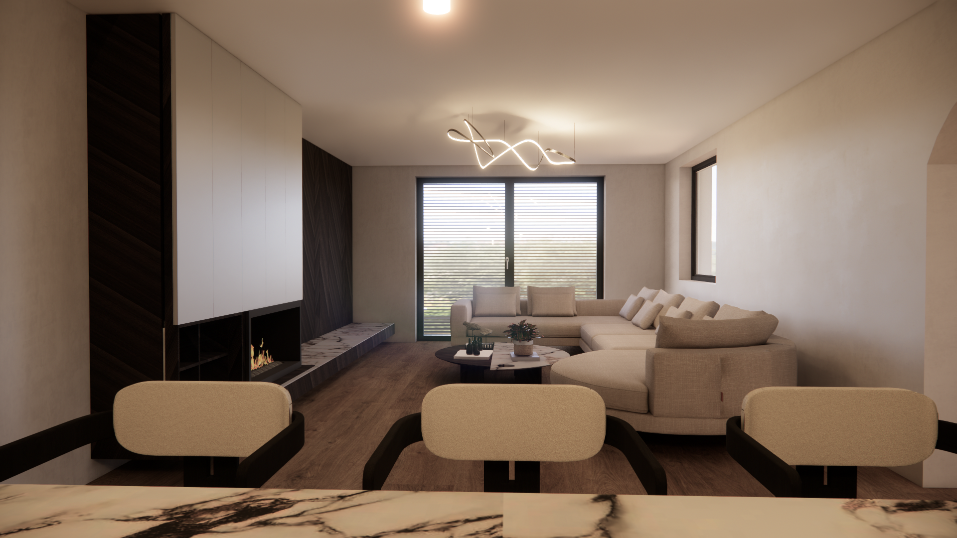 ultra realistic modern living room warm minimalist interior curved modular beige sofa round marble and walnut coffee table linear fireplace built into dark walnut chevron wall panels floating marble bench oak hardwood floor sculptural led ribbon chandelier floor to ceiling window with blinds soft daylight neutral beige and brown palette luxury contemporary interior open space living dining area architectural visualization vray render octane render global illumination soft shadows interior photography wide angle lens 8k highly detailed