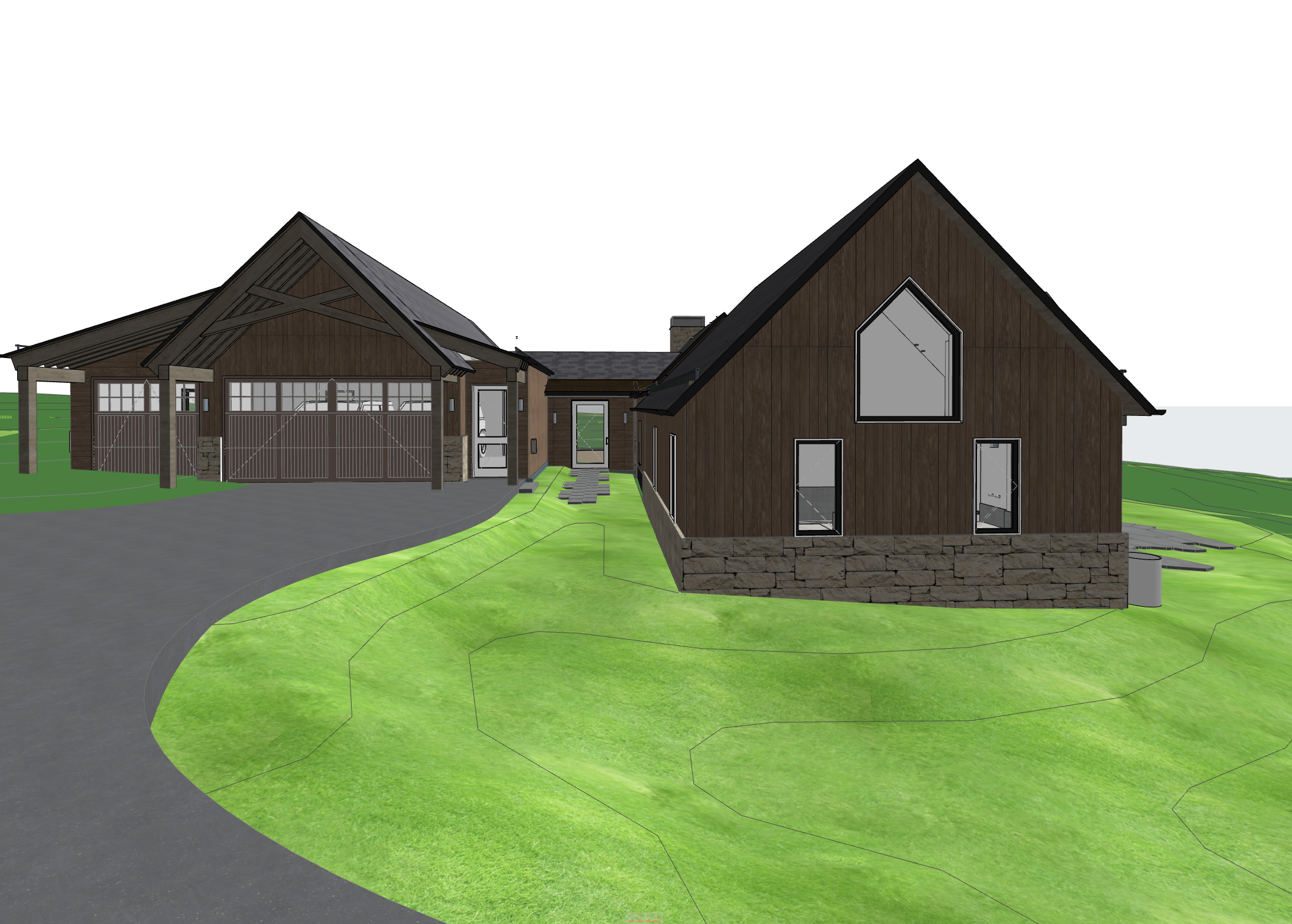 render a photorealistic 3d perspective of this house in a glenwood springs co reference the current material style just enhance them brown standing seam metal roof vertical and horizontal dark wood siding colorado buff rough face limestone half walls where shown keep model geometry the same windows doors roof walls garage door pavement driveway make a lush vegetation that looks native to glenwood springs co do not change the view only enhance the current materials and make the landscape nicer vegetation detailed textures in the wood siding and glass reflections and a vibrant clear sky with light atmospheric depth render in hyper realistic architectural visualization quality 8k resolution