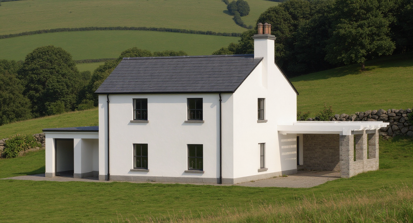 convert this floor plan into a minimalist isometric 3d view of a full house show the space from an elevated angle with furniture walls and details visible transitional farmhouse 12 foot ceilings in all bedrooms and bathrooms and office gable center of living room wood tongue and groove and beams in living room minimalist look marble countertops wood flooring white metal sheets on exterior black metal roof courtyard in front on either side of the front door use the same furniture as shows on the plan do not change the orientation of the floorplan