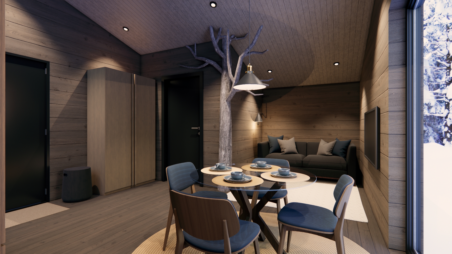 there is a dead standing pine in finnish kelo used as a decoration in the room the atmosphere is cozy