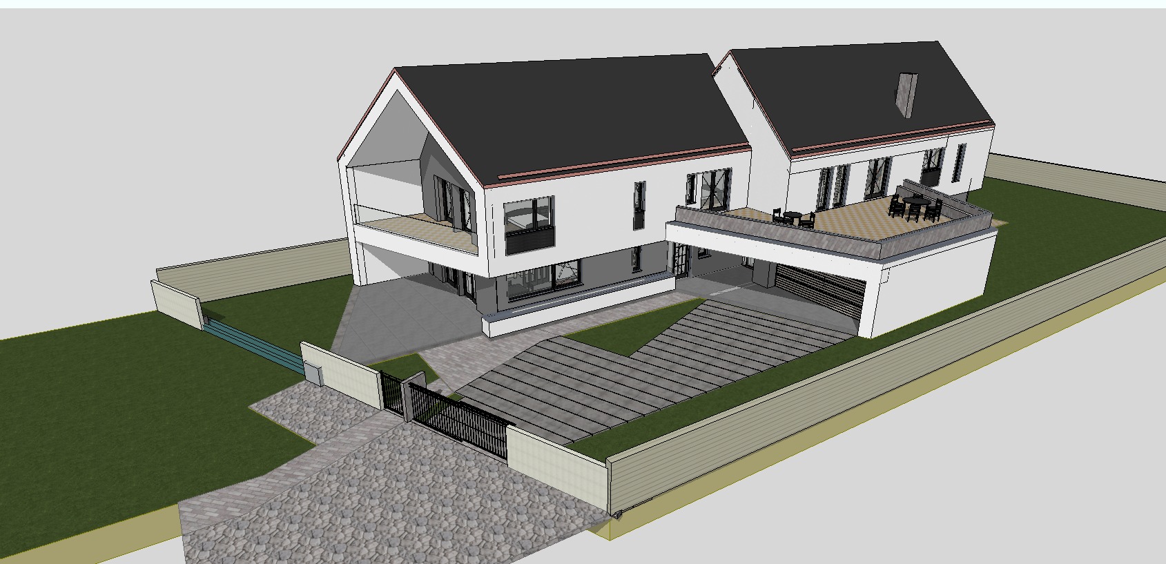 in winter lots of snow decorated with colored christmas lights outlining the roof vegetation background and trees also other mansions in the background