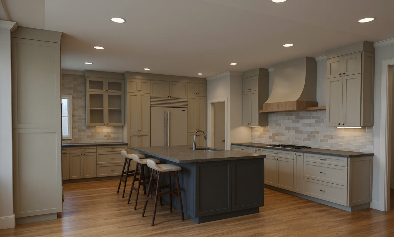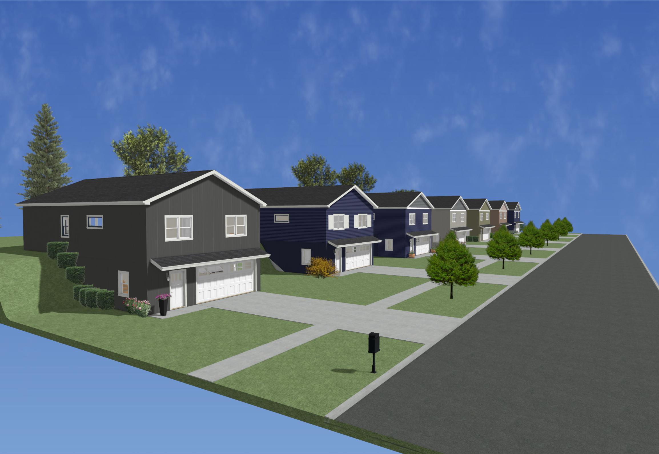 render a serene suburban neighborhood scene featuring a row of modern two story homes with dark gray and navy blue exteriors the houses have white trim large glossy windows and neatly manicured bushes the lawns are lush green contrasting with the light gray concrete driveways emphasize a clear blue sky with soft wispy clouds creating a peaceful and inviting atmosphere add vibrant green trees along the street and a black mailbox near the sidewalk for detail