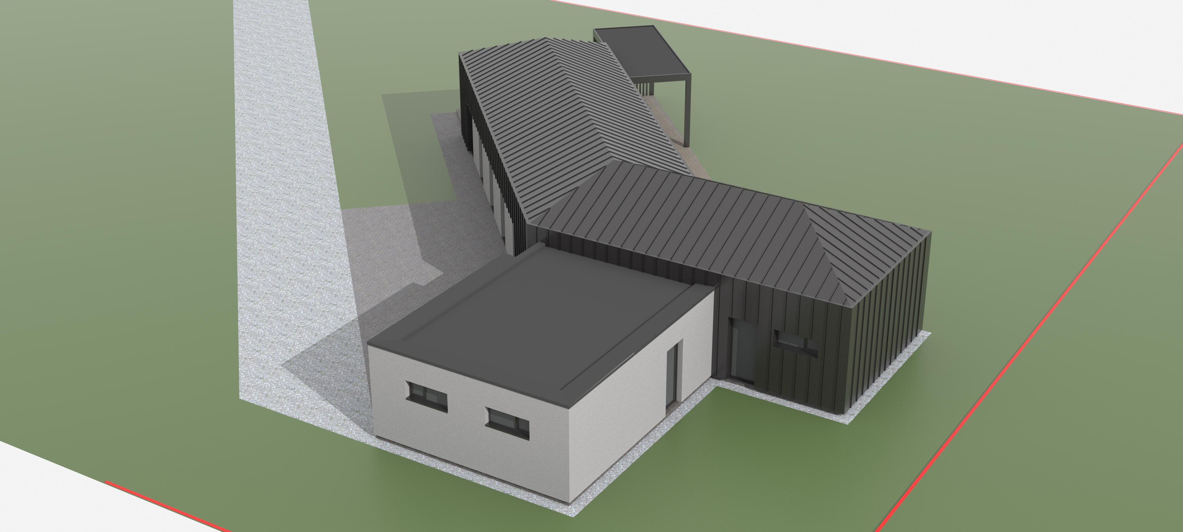 render a modern architectural building with a sleek linear design feature a structure with a charcoal gray metal roof and facade with segments of light grey plaster creating a minimalist aesthetic the roof and walls reflect a glossy black that contrasts with the light gray paving and gravel driveway the area around the building is covered in lush green grass set the scene in a clear bright atmosphere with soft sunlight casting gentle shadows enhancing the building s modern elegance change red line to dark grey metal wire fence make windows transparent