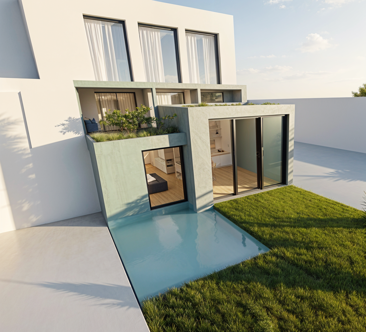create a photorealistic architectural rendering of this house extension preserve the exact building colors shapes and proportions beton cire green including the garden floor continuation add seddum on the roof