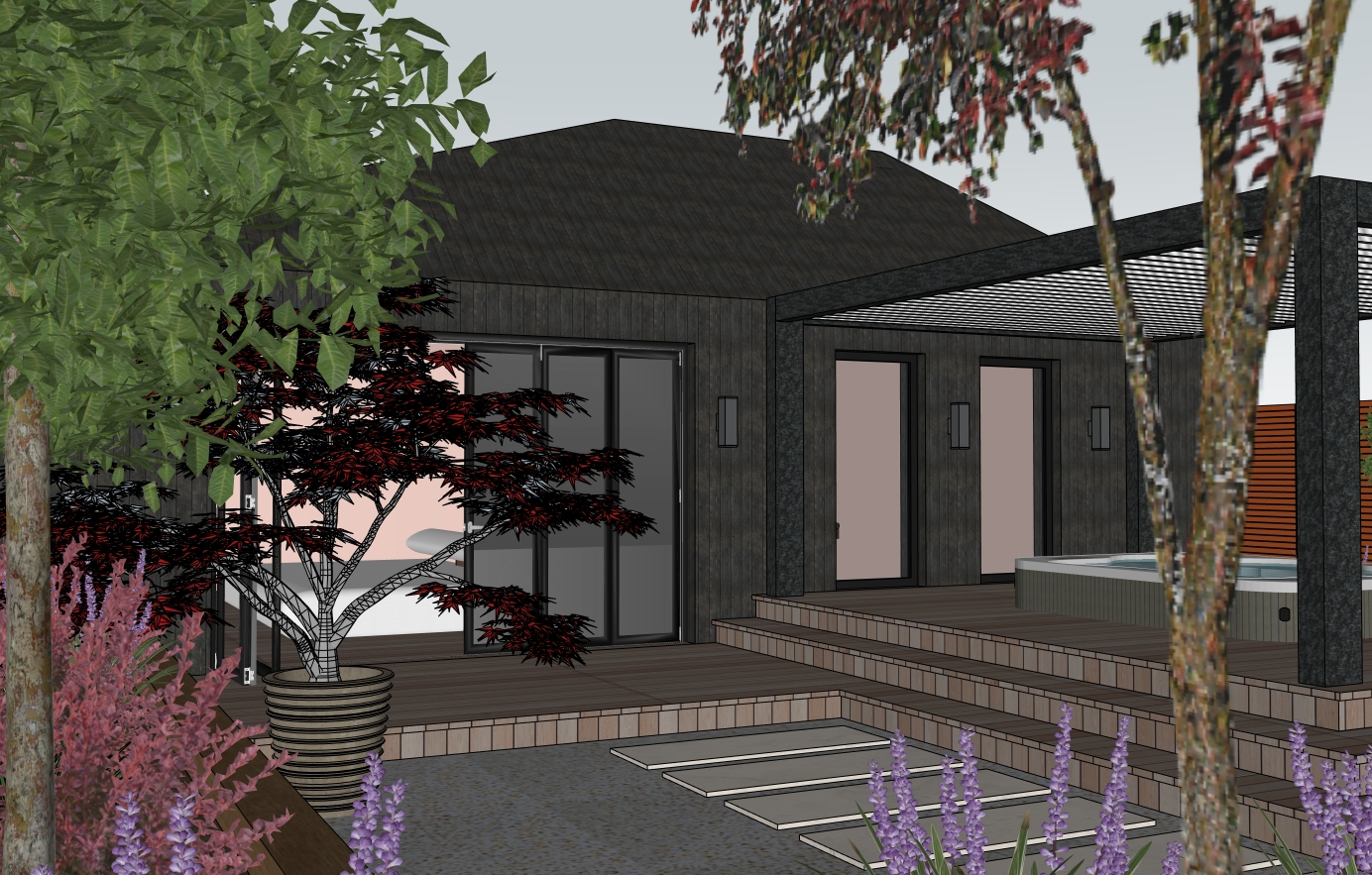 photorealistic render of garden outhouse japanese style gravel add concealed soft strip led lighting warm white under stair nosings warm glow to building interior which should be seen through the glazed doors also show up down lighting to wall mounted lights warm glow atmospheric render with early evening light once sun has gone down