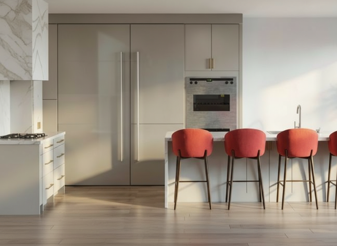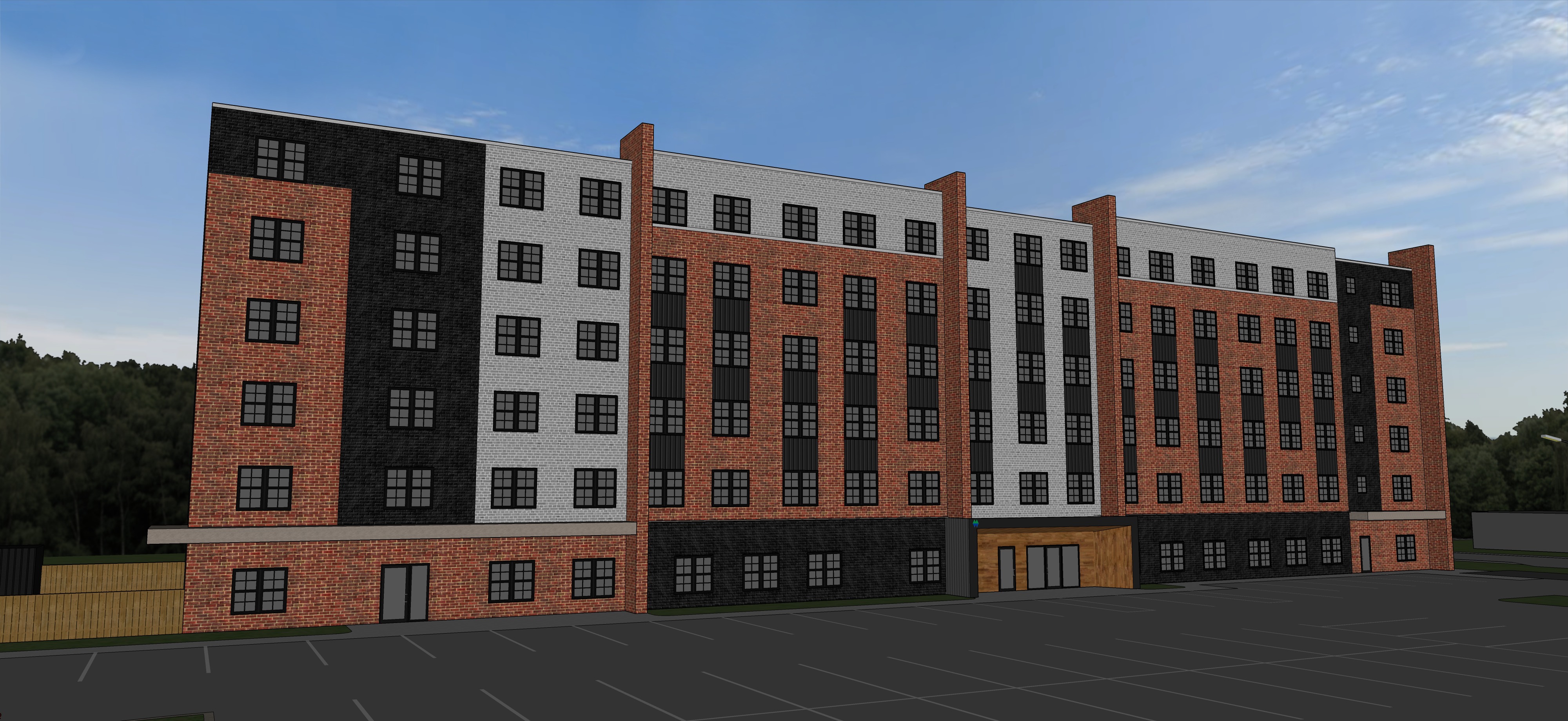 render a photorealistic 3d perspective of this brand new apartment building in bracebridge ontario on a summer day reference the current material styles and colours just enhance the black red and grey brick keep model geometry the same for windows doors and walls black decorative window mullions small town background with houses enhance the current materials glass reflections render in hyper realistic architectural visualization quality 8k resolution keep model geometry the same do not change the camera angle