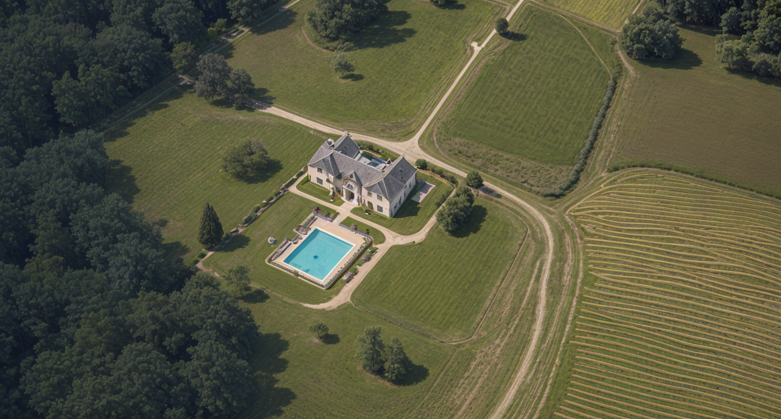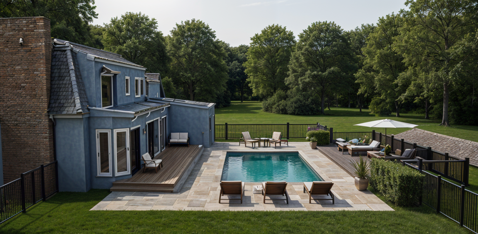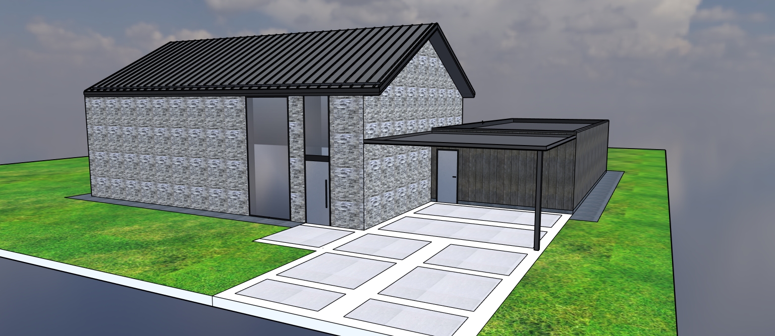 green woods low mountain soft grey stone wall a carport black golfed roof lawn around the house