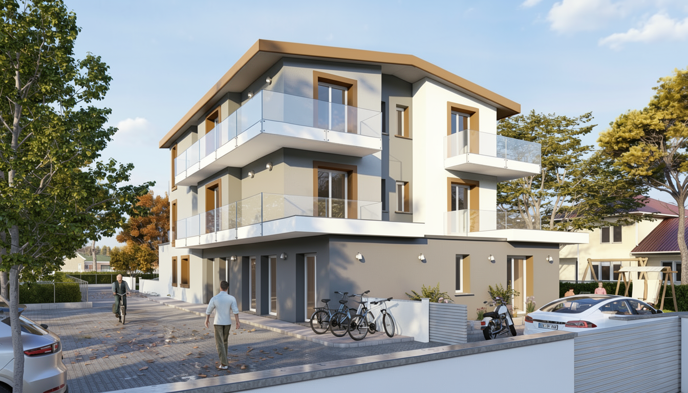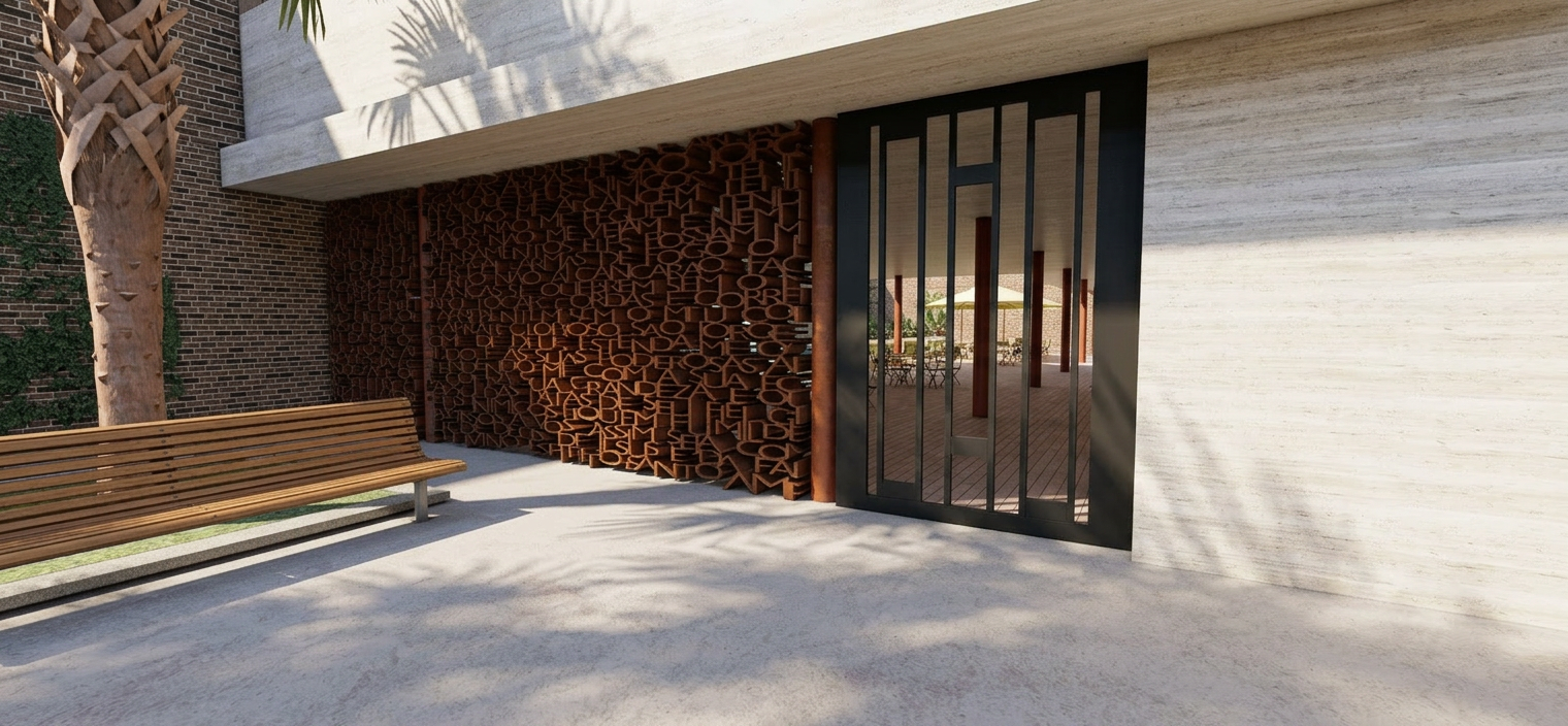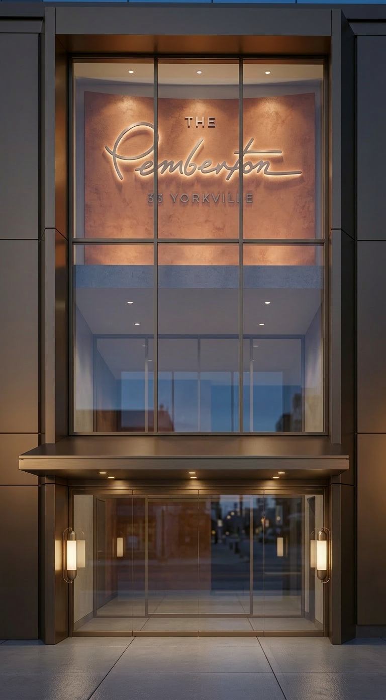 create a photorealistic architectural rendering using the uploaded image as the base reference maintain the same architecture proportions composition and design elements from the image while improving realism materials and lighting architecture keep the same architectural layout shown in the image a rectangular canopy projecting above the entrance a glass curtain wall above the canopy revealing the slab of the upper floor behind the curtain wall there is a feature wall in a warm orange brown tone with the building logo centered and softly backlit with led lighting the main entrance doors below the canopy should be glass with elegant metal framing respecting the existing proportions and openings the two middle doors must be automatic sliding glass doors remove door handles from the sliding doors since automatic sliding doors do not require handles materiality and style adjust the palette to a cooler more contemporary silver toned aesthetic facade cladding in silvery metallic panels or cool grey aluminum panels with subtle joints canopy structure finished in brushed aluminum or stainless steel instead of champagne bronze window and curtain wall frames in white aluminum glass should be clear and reflective with subtle city reflections the feature wall behind the logo remains warm terracotta burnt orange to create contrast lighting very important warm architectural lighting 3000k above the canopy washing the curtain wall and upper wall recessed downlights under the canopy creating the ambience of a luxury hotel entrance additional lighting above the canopy to softly wall wash the curtain wall soft led backlighting behind the logo on the feature wall wall sconces on the sides of the entrance similar to the reference image but slightly smaller mounted slightly higher correctly scaled to the entrance doors atmosphere and realism evening dusk lighting to highlight the architectural lighting cinematic reflections on metal and glass realistic materials global illumination soft shadows luxury yorkville condominium entrance aesthetic clean urban sidewalk and subtle city reflections in the glass camera maintain the same frontal perspective from the reference image slightly wide architectural lens 24 35mm symmetrical composition centered on the entrance important instruction preserve the architecture and proportions from the uploaded image while only enhancing realism materials color palette and lighting