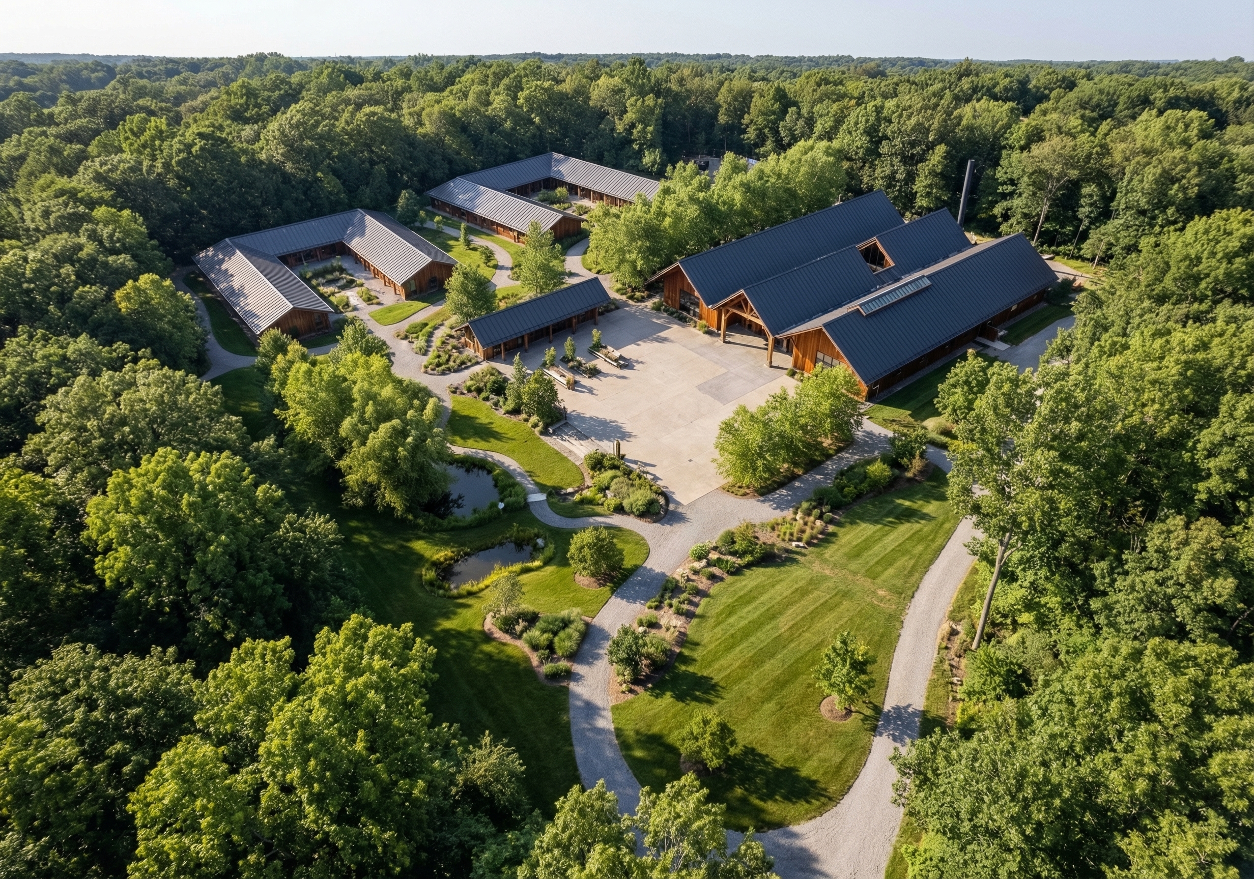 exterior shot photorealistic aerial perspective of the architectural site sketch showing multiple buildings with pitched roofs surrounded by dense trees detailed landscaping with pathways and a courtyard realistic textures of grass trees building materials like metal wood for roofs natural daylight lighting crisp shadows and high detail suitable for architectural visualization and client presentation