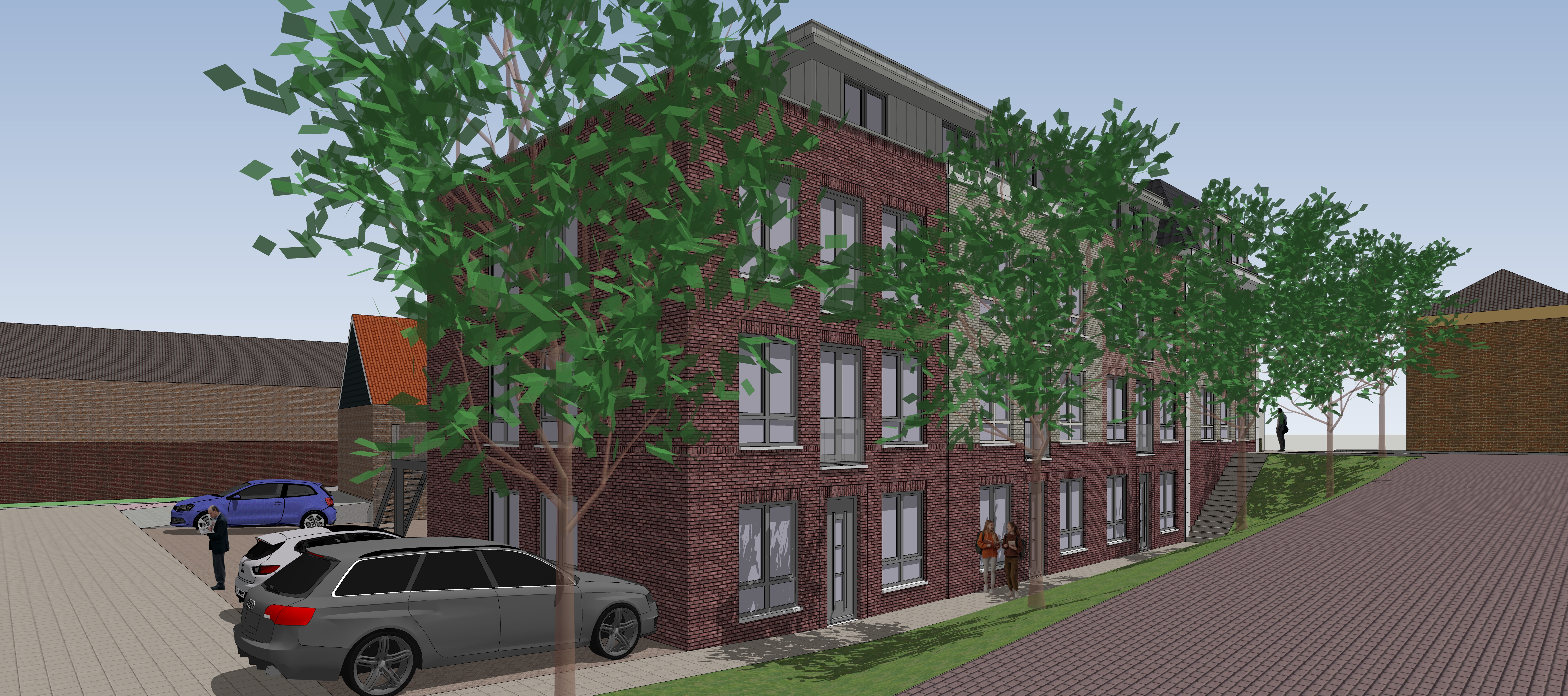 add curtains behind windows change trees for oak trees point sun on facade