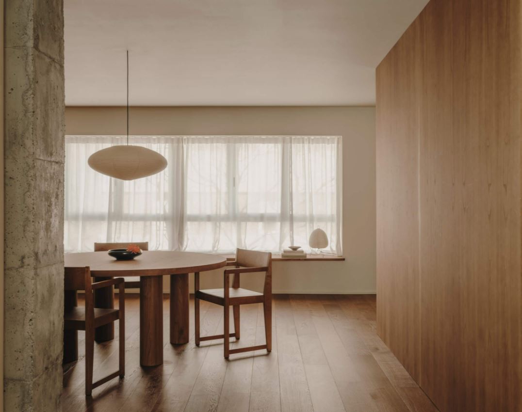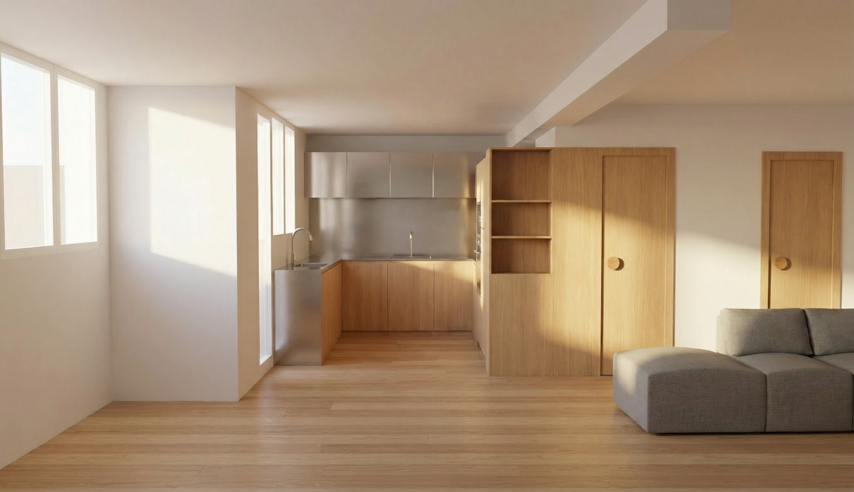exterior shot render a modern minimalist interior of a living space with warm natural lighting use soft white walls and ceilings to create a clean and airy atmosphere incorporate light wood tones for the flooring cabinets and doors to add warmth and natural texture include a sleek kitchen area with metallic silver appliances and accent the room with a contemporary gray sofa emphasize a serene and inviting ambiance with soft sunlight streaming through large windows casting gentle shadows on the floor and walls